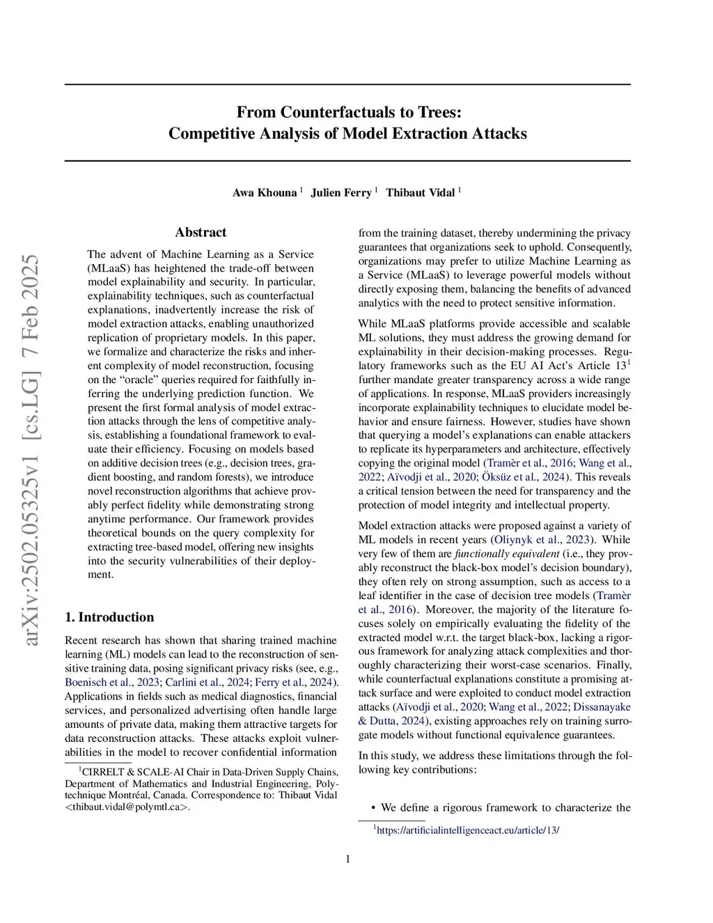 The advent of Machine Learning as a Service (MLaaS) has heightened the trade-off between model explainability and security. In particular, explainability techniques, such as counterfactual explanations, inadvertently increase the risk of model extraction attacks, enabling unauthorized replication of proprietary models. In this paper, we formalize and characterize the risks and inherent complexity of model reconstruction, focusing on the "oracle'' queries required for faithfully inferring the underlying prediction function. We present the first formal analysis of model extraction attacks through the lens of competitive analysis, establishing a foundational framework to evaluate their efficiency. Focusing on models based on additive decision trees (e.g., decision trees, gradient boosting, and random forests), we introduce novel reconstruction algorithms that achieve provably perfect fidelity while demonstrating strong anytime performance. Our framework provides theoretical bounds on the query complexity for extracting tree-based model, offering new insights into the security vulnerabilities of their deployment.