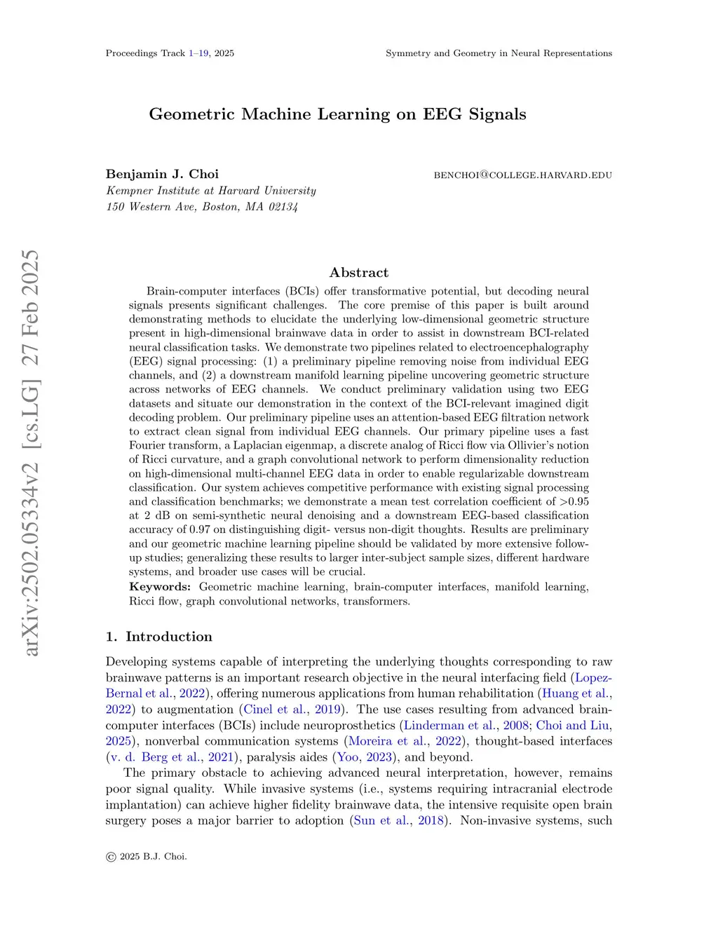 Brain-computer interfaces (BCIs) offer transformative potential, but decoding neural signals presents significant challenges. The core premise of this paper is built around demonstrating methods to elucidate the underlying low-dimensional geometric structure present in high-dimensional brainwave data in order to assist in downstream BCI-related neural classification tasks. We demonstrate two pipelines related to electroencephalography (EEG) signal processing: (1) a preliminary pipeline removing noise from individual EEG channels, and (2) a downstream manifold learning pipeline uncovering geometric structure across networks of EEG channels. We conduct preliminary validation using two EEG datasets and situate our demonstration in the context of the BCI-relevant imagined digit decoding problem. Our preliminary pipeline uses an attention-based EEG filtration network to extract clean signal from individual EEG channels. Our primary pipeline uses a fast Fourier transform, a Laplacian eigenmap, a discrete analog of Ricci flow via Ollivier's notion of Ricci curvature, and a graph convolutional network to perform dimensionality reduction on high-dimensional multi-channel EEG data in order to enable regularizable downstream classification. Our system achieves competitive performance with existing signal processing and classification benchmarks; we demonstrate a mean test correlation coefficient of >0.95 at 2 dB on semi-synthetic neural denoising and a downstream EEG-based classification accuracy of 0.97 on distinguishing digit- versus non-digit- thoughts. Results are preliminary and our geometric machine learning pipeline should be validated by more extensive follow-up studies; generalizing these results to larger inter-subject sample sizes, different hardware systems, and broader use cases will be crucial.