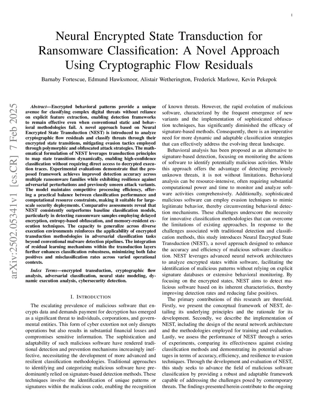Encrypted behavioral patterns provide a unique avenue for classifying complex digital threats without reliance on explicit feature extraction, enabling detection frameworks to remain effective even when conventional static and behavioral methodologies fail. A novel approach based on Neural Encrypted State Transduction (NEST) is introduced to analyze cryptographic flow residuals and classify threats through their encrypted state transitions, mitigating evasion tactics employed through polymorphic and obfuscated attack strategies. The mathematical formulation of NEST leverages transduction principles to map state transitions dynamically, enabling high-confidence classification without requiring direct access to decrypted execution traces. Experimental evaluations demonstrate that the proposed framework achieves improved detection accuracy across multiple ransomware families while exhibiting resilience against adversarial perturbations and previously unseen attack variants. The model maintains competitive processing efficiency, offering a practical balance between classification performance and computational resource constraints, making it suitable for large-scale security deployments. Comparative assessments reveal that NEST consistently outperforms baseline classification models, particularly in detecting ransomware samples employing delayed encryption, entropy-based obfuscation, and memory-resident execution techniques. The capacity to generalize across diverse execution environments reinforces the applicability of encrypted transduction methodologies in adversarial classification tasks beyond conventional malware detection pipelines. The integration of residual learning mechanisms within the transduction layers further enhances classification robustness, minimizing both false positives and misclassification rates across varied operational contexts.
