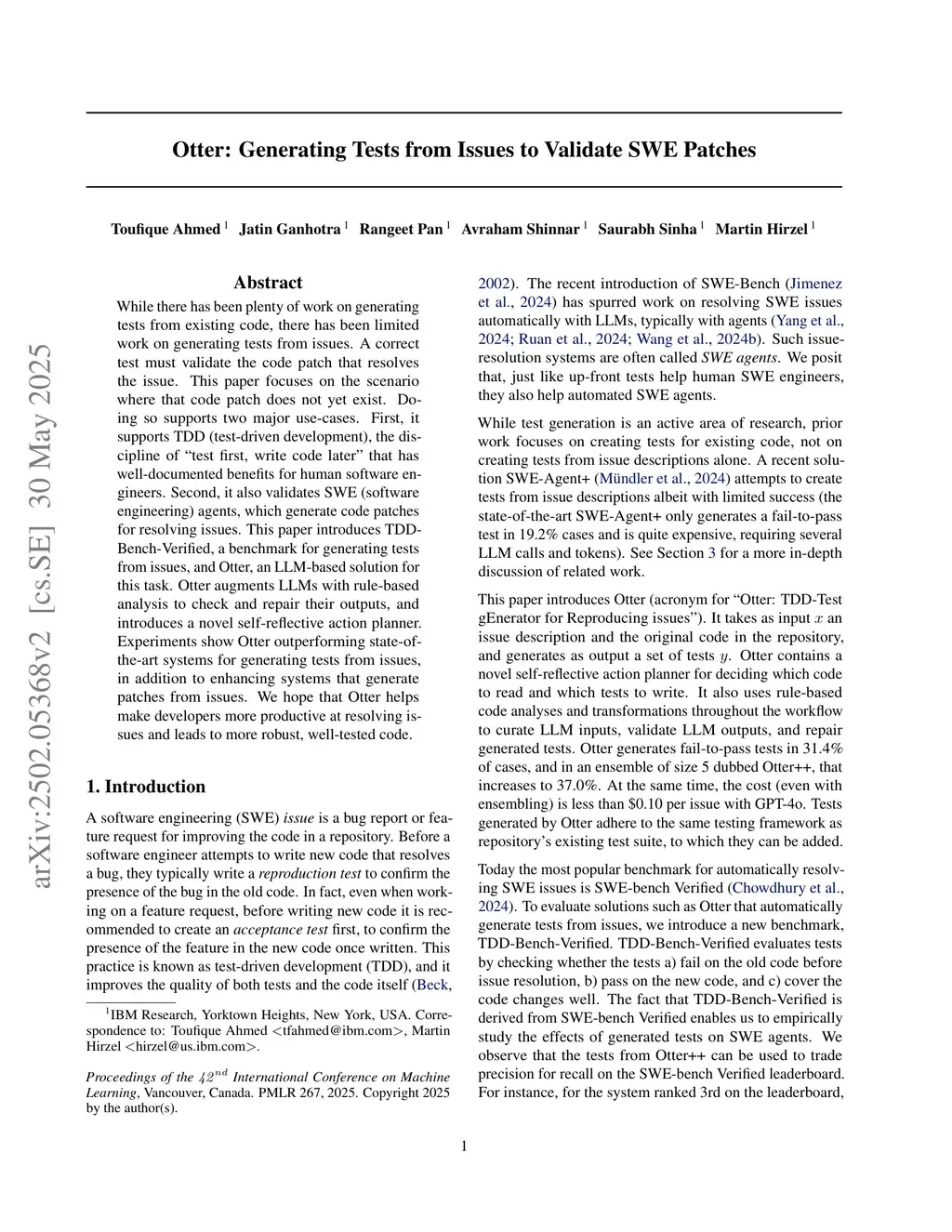 While there has been plenty of work on generating tests from existing code, there has been limited work on generating tests from issues. A correct test must validate the code patch that resolves the issue. This paper focuses on the scenario where that code patch does not yet exist. Doing so supports two major use-cases. First, it supports TDD (test-driven development), the discipline of "test first, write code later" that has well-documented benefits for human software engineers. Second, it also validates SWE (software engineering) agents, which generate code patches for resolving issues. This paper introduces TDD-Bench-Verified, a benchmark for generating tests from issues, and Otter, an LLM-based solution for this task. Otter augments LLMs with rule-based analysis to check and repair their outputs, and introduces a novel self-reflective action planner. Experiments show Otter outperforming state-of-the-art systems for generating tests from issues, in addition to enhancing systems that generate patches from issues. We hope that Otter helps make developers more productive at resolving issues and leads to more robust, well-tested code.