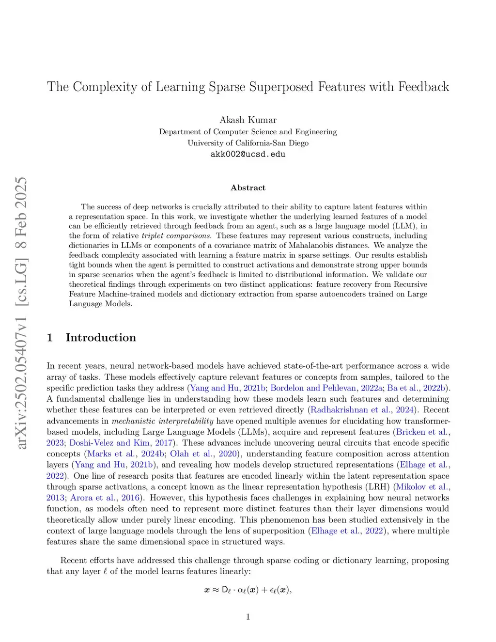 The success of deep networks is crucially attributed to their ability to capture latent features within a representation space. In this work, we investigate whether the underlying learned features of a model can be efficiently retrieved through feedback from an agent, such as a large language model (LLM), in the form of relative \tt{triplet comparisons}. These features may represent various constructs, including dictionaries in LLMs or a covariance matrix of Mahalanobis distances. We analyze the feedback complexity associated with learning a feature matrix in sparse settings. Our results establish tight bounds when the agent is permitted to construct activations and demonstrate strong upper bounds in sparse scenarios when the agent's feedback is limited to distributional information. We validate our theoretical findings through experiments on two distinct applications: feature recovery from Recursive Feature Machines and dictionary extraction from sparse autoencoders trained on Large Language Models.
