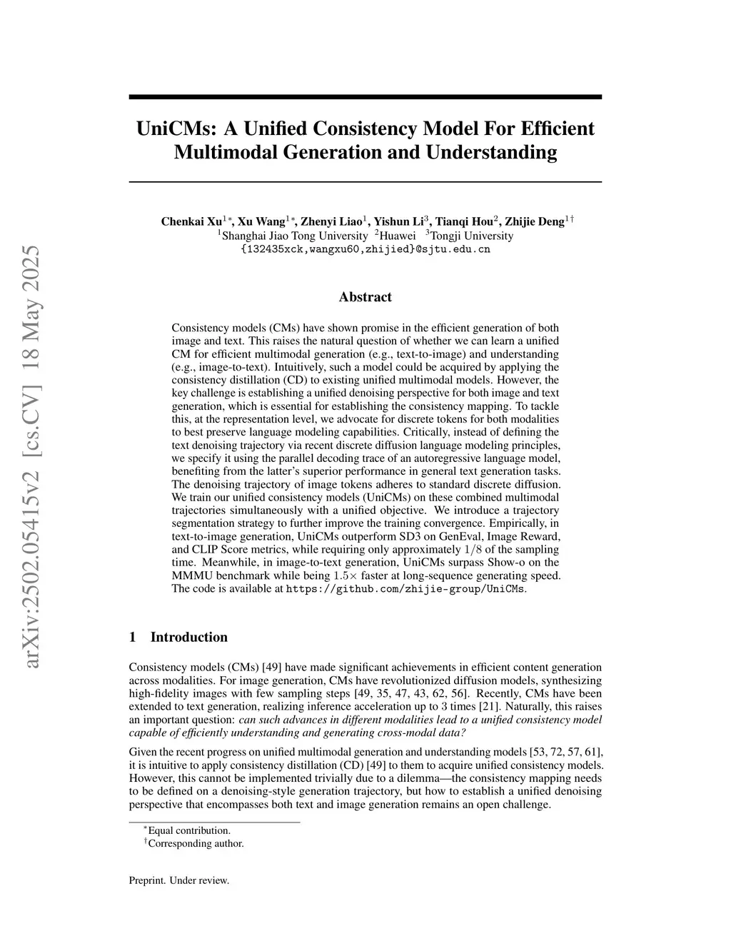 Consistency models (CMs) have shown promise in the efficient generation of both image and text. This raises the natural question of whether we can learn a unified CM for efficient multimodal generation (e.g., text-to-image) and understanding (e.g., image-to-text). Intuitively, such a model could be acquired by applying the consistency distillation (CD) to existing unified multimodal models. However, the key challenge is establishing a unified denoising perspective for both image and text generation, which is essential for establishing the consistency mapping. To tackle this, at the representation level, we advocate for discrete tokens for both modalities to best preserve language modeling capabilities. Critically, instead of defining the text denoising trajectory via recent discrete diffusion language modeling principles, we specify it using the parallel decoding trace of an autoregressive language model, benefiting from the latter's superior performance in general text generation tasks. The denoising trajectory of image tokens adheres to standard discrete diffusion. We train our unified consistency models (UniCMs) on these combined multimodal trajectories simultaneously with a unified objective. We introduce a trajectory segmentation strategy to further improve the training convergence. Empirically, in text-to-image generation, UniCMs outperform SD3 on GenEval, Image Reward, and CLIP Score metrics, while requiring only approximately of the sampling time. Meanwhile, in image-to-text generation, UniCMs surpass Show-o on the MMMU benchmark while being faster at long-sequence generating speed. The code is available atthis https URL.