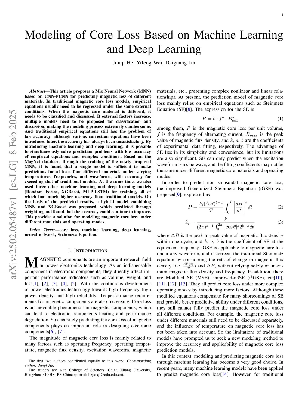 This article proposes a Mix Neural Network (MNN) based on CNN-FCNN for predicting magnetic loss of different materials. In traditional magnetic core loss models, empirical equations usually need to be regressed under the same external conditions. When the magnetic core material is different, it needs to be classified and discussed. If external factors increase, multiple models need to be proposed for classification and discussion, making the modeling process extremely cumbersome. And traditional empirical equations still has the problem of low accuracy, although various correction equations have been introduced later, the accuracy has always been unsatisfactory. By introducing machine learning and deep learning, it is possible to simultaneously solve prediction problems with low accuracy of empirical equations and complex conditions. Based on the MagNet database, through the training of the newly proposed MNN, it is found that a single model is sufficient to make predictions for at least four different materials under varying temperatures, frequencies, and waveforms, with accuracy far exceeding that of traditional models. At the same time, we also used three other machine learning and deep learning models (Random Forest, XGBoost, MLP-LSTM) for training, all of which had much higher accuracy than traditional models. On the basis of the predicted results, a hybrid model combining MNN and XGBoost was proposed, which predicted through weighting and found that the accuracy could continue to improve. This provides a solution for modeling magnetic core loss under different materials and operating modes.