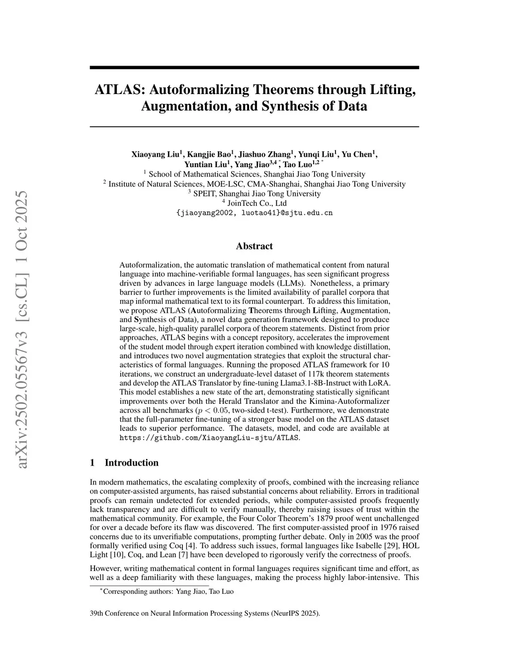ATLAS: Autoformalizing Theorems through Lifting, Augmentation, and Synthesis of Data