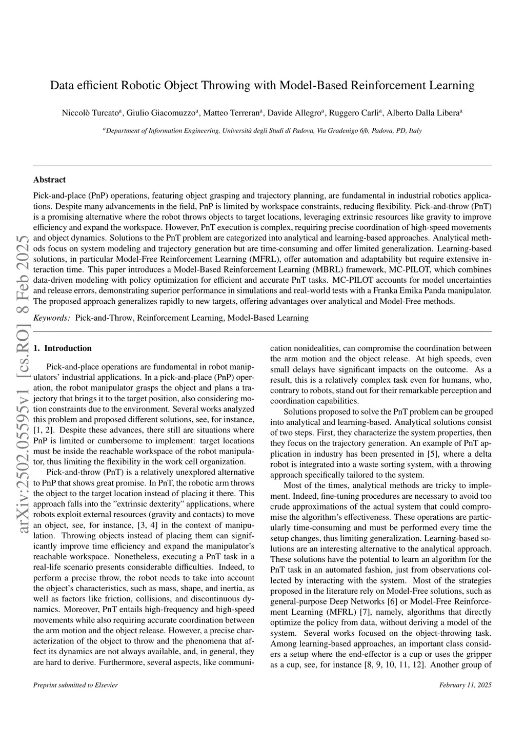 Pick-and-place (PnP) operations, featuring object grasping and trajectory planning, are fundamental in industrial robotics applications. Despite many advancements in the field, PnP is limited by workspace constraints, reducing flexibility. Pick-and-throw (PnT) is a promising alternative where the robot throws objects to target locations, leveraging extrinsic resources like gravity to improve efficiency and expand the workspace. However, PnT execution is complex, requiring precise coordination of high-speed movements and object dynamics. Solutions to the PnT problem are categorized into analytical and learning-based approaches. Analytical methods focus on system modeling and trajectory generation but are time-consuming and offer limited generalization. Learning-based solutions, in particular Model-Free Reinforcement Learning (MFRL), offer automation and adaptability but require extensive interaction time. This paper introduces a Model-Based Reinforcement Learning (MBRL) framework, MC-PILOT, which combines data-driven modeling with policy optimization for efficient and accurate PnT tasks. MC-PILOT accounts for model uncertainties and release errors, demonstrating superior performance in simulations and real-world tests with a Franka Emika Panda manipulator. The proposed approach generalizes rapidly to new targets, offering advantages over analytical and Model-Free methods.