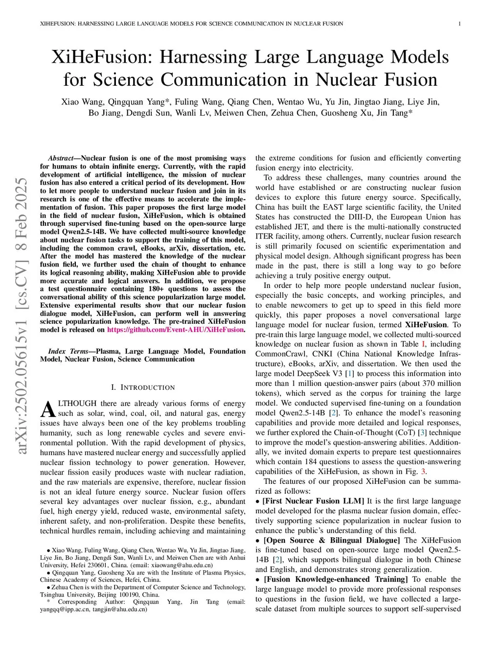 Nuclear fusion is one of the most promising ways for humans to obtain infinite energy. Currently, with the rapid development of artificial intelligence, the mission of nuclear fusion has also entered a critical period of its development. How to let more people to understand nuclear fusion and join in its research is one of the effective means to accelerate the implementation of fusion. This paper proposes the first large model in the field of nuclear fusion, XiHeFusion, which is obtained through supervised fine-tuning based on the open-source large model Qwen2.5-14B. We have collected multi-source knowledge about nuclear fusion tasks to support the training of this model, including the common crawl, eBooks, arXiv, dissertation, etc. After the model has mastered the knowledge of the nuclear fusion field, we further used the chain of thought to enhance its logical reasoning ability, making XiHeFusion able to provide more accurate and logical answers. In addition, we propose a test questionnaire containing 180+ questions to assess the conversational ability of this science popularization large model. Extensive experimental results show that our nuclear fusion dialogue model, XiHeFusion, can perform well in answering science popularization knowledge. The pre-trained XiHeFusion model is released onthis https URL.