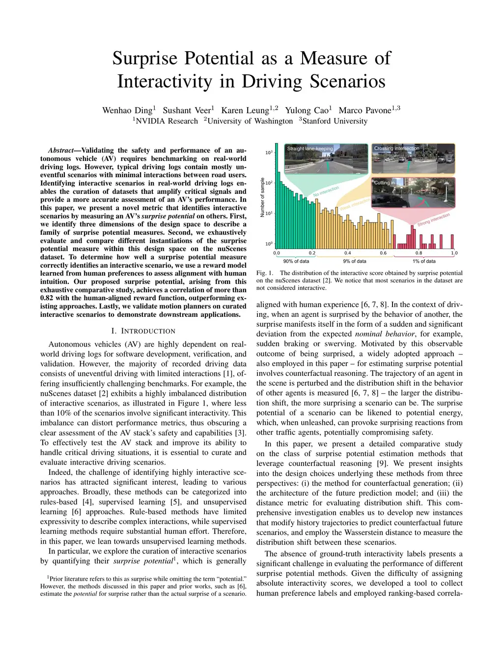Validating the safety and performance of an autonomous vehicle (AV) requires benchmarking on real-world driving logs. However, typical driving logs contain mostly uneventful scenarios with minimal interactions between road users. Identifying interactive scenarios in real-world driving logs enables the curation of datasets that amplify critical signals and provide a more accurate assessment of an AV's performance. In this paper, we present a novel metric that identifies interactive scenarios by measuring an AV's surprise potential on others. First, we identify three dimensions of the design space to describe a family of surprise potential measures. Second, we exhaustively evaluate and compare different instantiations of the surprise potential measure within this design space on the nuScenes dataset. To determine how well a surprise potential measure correctly identifies an interactive scenario, we use a reward model learned from human preferences to assess alignment with human intuition. Our proposed surprise potential, arising from this exhaustive comparative study, achieves a correlation of more than 0.82 with the human-aligned reward function, outperforming existing approaches. Lastly, we validate motion planners on curated interactive scenarios to demonstrate downstream applications.