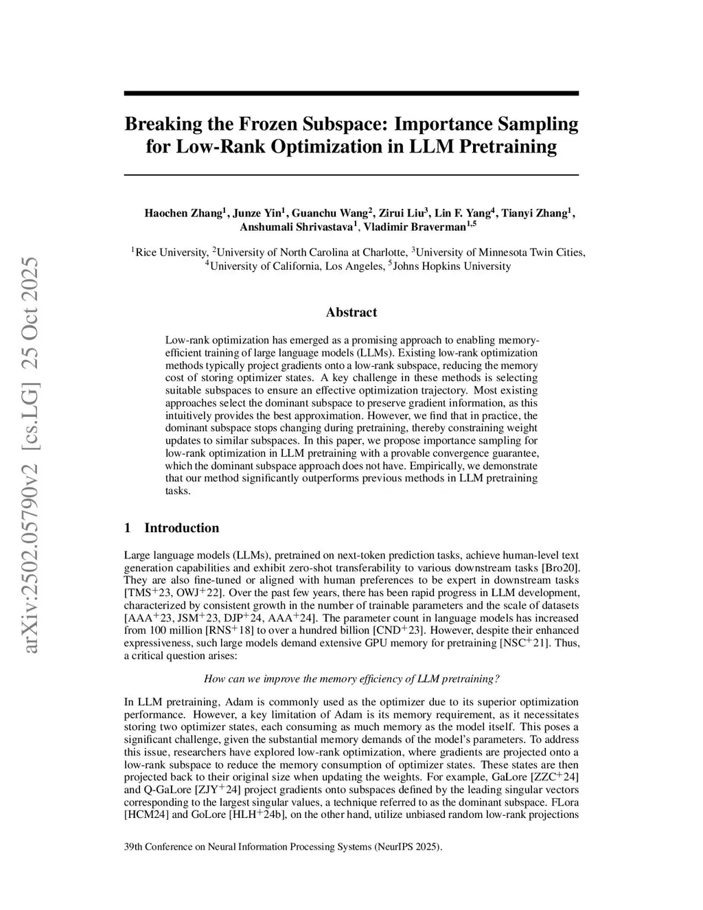 Low-rank optimization has emerged as a promising approach to enabling memory-efficient training of large language models (LLMs). Existing low-rank optimization methods typically project gradients onto a low-rank subspace, reducing the memory cost of storing optimizer states. A key challenge in these methods is selecting suitable subspaces to ensure an effective optimization trajectory. Most existing approaches select the dominant subspace to preserve gradient information, as this intuitively provides the best approximation. However, we find that in practice, the dominant subspace stops changing during pretraining, thereby constraining weight updates to similar subspaces. In this paper, we propose importance sampling for low-rank optimization in LLM pretraining with a provable convergence guarantee, which the dominant subspace approach does not have. Empirically, we demonstrate that our method significantly outperforms previous methods in LLM pretraining tasks.