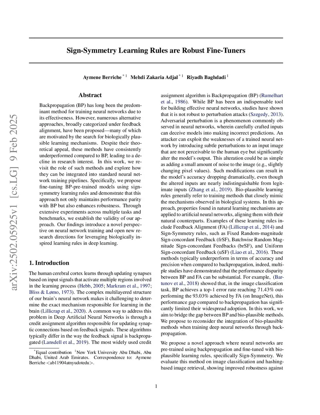 Backpropagation (BP) has long been the predominant method for training neural networks due to its effectiveness. However, numerous alternative approaches, broadly categorized under feedback alignment, have been proposed, many of which are motivated by the search for biologically plausible learning mechanisms. Despite their theoretical appeal, these methods have consistently underperformed compared to BP, leading to a decline in research interest. In this work, we revisit the role of such methods and explore how they can be integrated into standard neural network training pipelines. Specifically, we propose fine-tuning BP-pre-trained models using Sign-Symmetry learning rules and demonstrate that this approach not only maintains performance parity with BP but also enhances robustness. Through extensive experiments across multiple tasks and benchmarks, we establish the validity of our approach. Our findings introduce a novel perspective on neural network training and open new research directions for leveraging biologically inspired learning rules in deep learning.