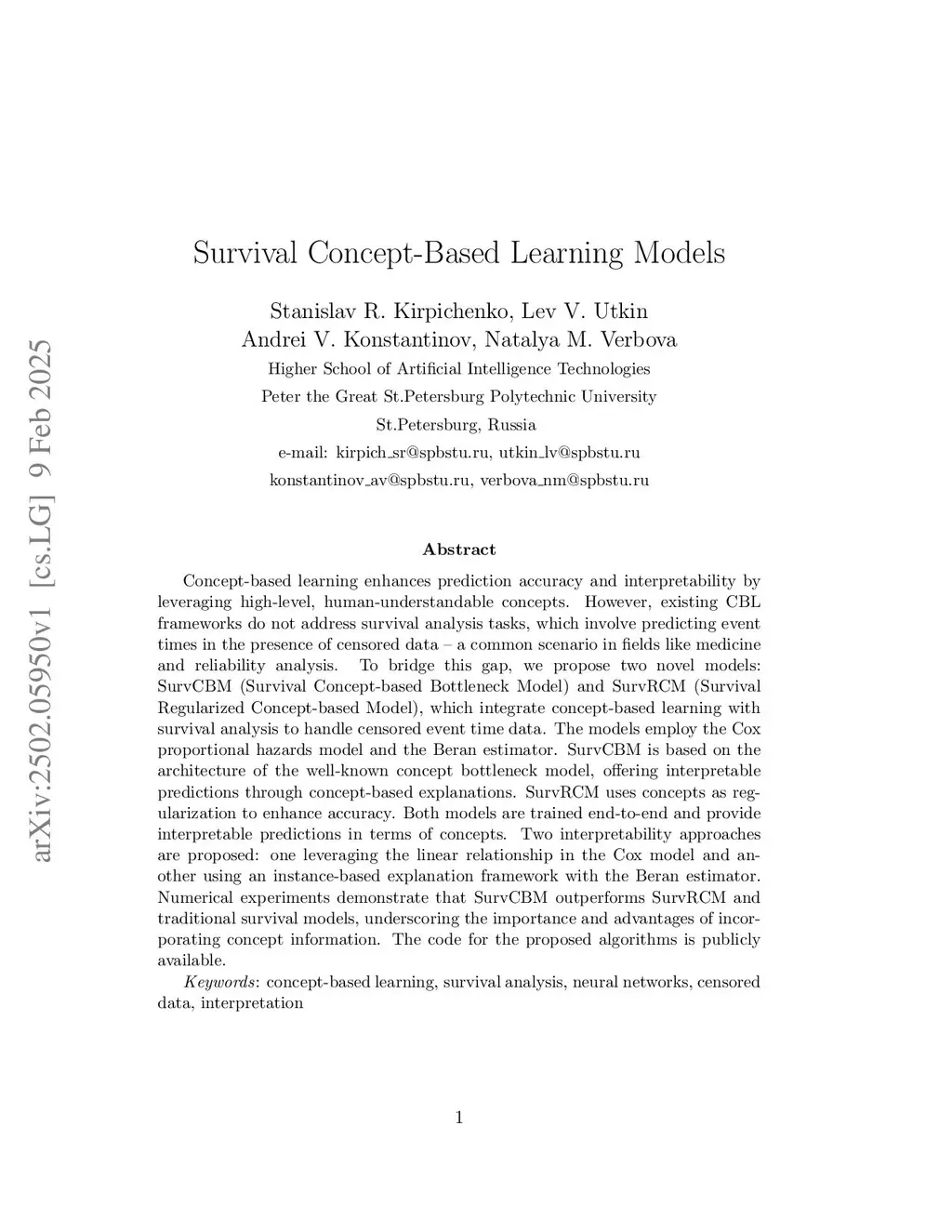 Concept-based learning enhances prediction accuracy and interpretability by leveraging high-level, human-understandable concepts. However, existing CBL frameworks do not address survival analysis tasks, which involve predicting event times in the presence of censored data -- a common scenario in fields like medicine and reliability analysis. To bridge this gap, we propose two novel models: SurvCBM (Survival Concept-based Bottleneck Model) and SurvRCM (Survival Regularized Concept-based Model), which integrate concept-based learning with survival analysis to handle censored event time data. The models employ the Cox proportional hazards model and the Beran estimator. SurvCBM is based on the architecture of the well-known concept bottleneck model, offering interpretable predictions through concept-based explanations. SurvRCM uses concepts as regularization to enhance accuracy. Both models are trained end-to-end and provide interpretable predictions in terms of concepts. Two interpretability approaches are proposed: one leveraging the linear relationship in the Cox model and another using an instance-based explanation framework with the Beran estimator. Numerical experiments demonstrate that SurvCBM outperforms SurvRCM and traditional survival models, underscoring the importance and advantages of incorporating concept information. The code for the proposed algorithms is publicly available.