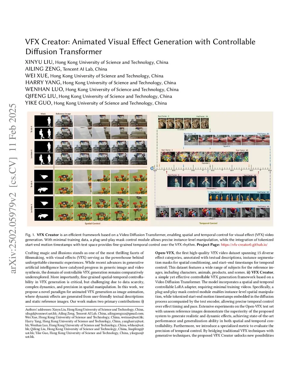 Crafting magic and illusions is one of the most thrilling aspects of filmmaking, with visual effects (VFX) serving as the powerhouse behind unforgettable cinematic experiences. While recent advances in generative artificial intelligence have driven progress in generic image and video synthesis, the domain of controllable VFX generation remains relatively underexplored. In this work, we propose a novel paradigm for animated VFX generation as image animation, where dynamic effects are generated from user-friendly textual descriptions and static reference images. Our work makes two primary contributions: (i) Open-VFX, the first high-quality VFX video dataset spanning 15 diverse effect categories, annotated with textual descriptions, instance segmentation masks for spatial conditioning, and start-end timestamps for temporal control. (ii) VFX Creator, a simple yet effective controllable VFX generation framework based on a Video Diffusion Transformer. The model incorporates a spatial and temporal controllable LoRA adapter, requiring minimal training videos. Specifically, a plug-and-play mask control module enables instance-level spatial manipulation, while tokenized start-end motion timestamps embedded in the diffusion process, alongside the text encoder, allow precise temporal control over effect timing and pace. Extensive experiments on the Open-VFX test set demonstrate the superiority of the proposed system in generating realistic and dynamic effects, achieving state-of-the-art performance and generalization ability in both spatial and temporal controllability. Furthermore, we introduce a specialized metric to evaluate the precision of temporal control. By bridging traditional VFX techniques with generative approaches, VFX Creator unlocks new possibilities for efficient and high-quality video effect generation, making advanced VFX accessible to a broader audience.