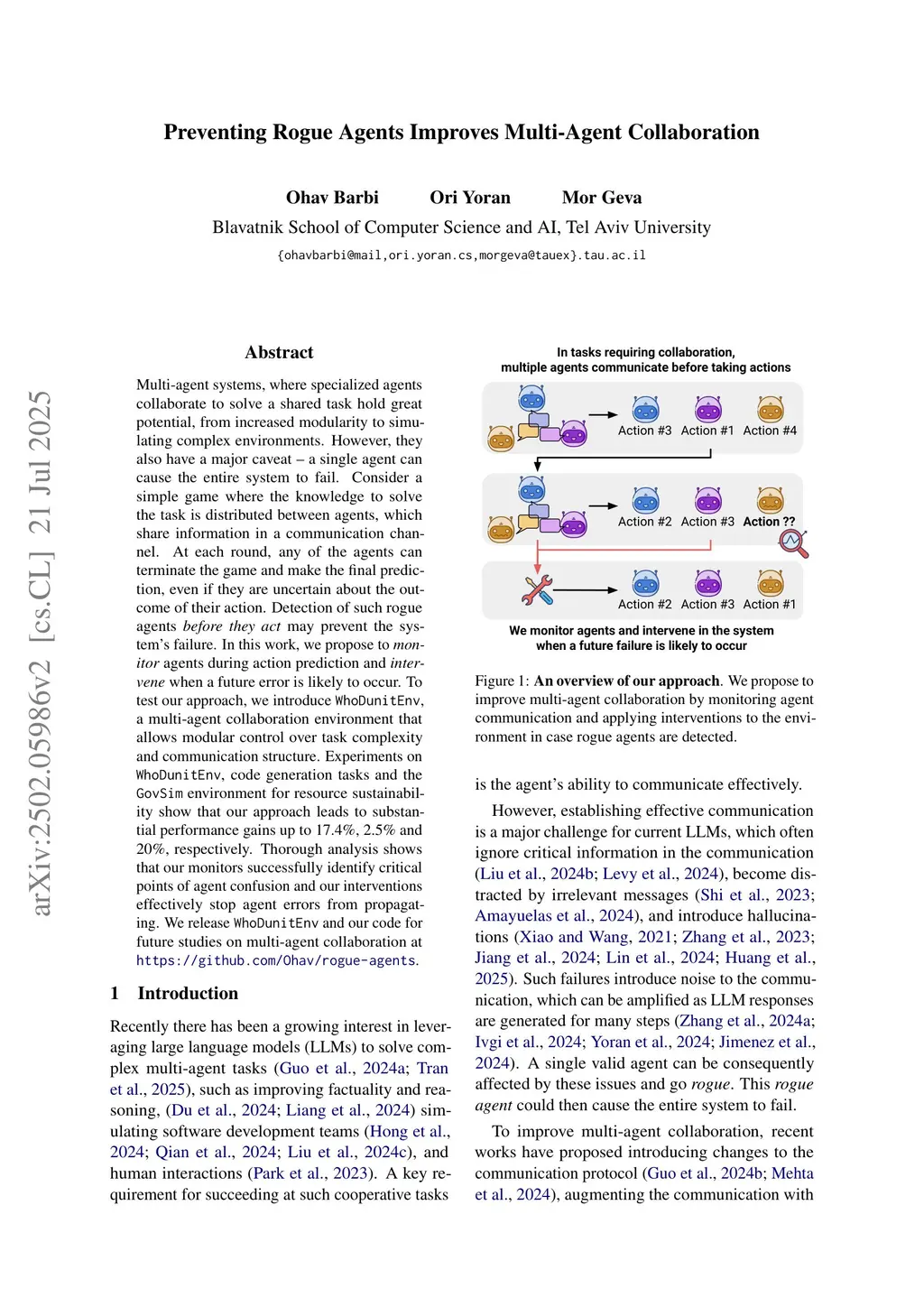 Multi-agent systems, where specialized agents collaborate to solve a shared task hold great potential, from increased modularity to simulating complex environments. However, they also have a major caveat -- a single agent can cause the entire system to fail. Consider a simple game where the knowledge to solve the task is distributed between agents, which share information in a communication channel. At each round, any of the agents can terminate the game and make the final prediction, even if they are uncertain about the outcome of their action. Detection of such rogue agents before they act may prevent the system's failure. In this work, we propose to monitor agents during action prediction and intervene when a future error is likely to occur. To test our approach, we introduce WhoDunitEnv, a multi-agent collaboration environment that allows modular control over task complexity and communication structure. Experiments on WhoDunitEnv, code generation tasks and the GovSim environment for resource sustainability show that our approach leads to substantial performance gains up to 17.4%, 2.5% and 20%, respectively. Thorough analysis shows that our monitors successfully identify critical points of agent confusion and our interventions effectively stop agent errors from propagating.
