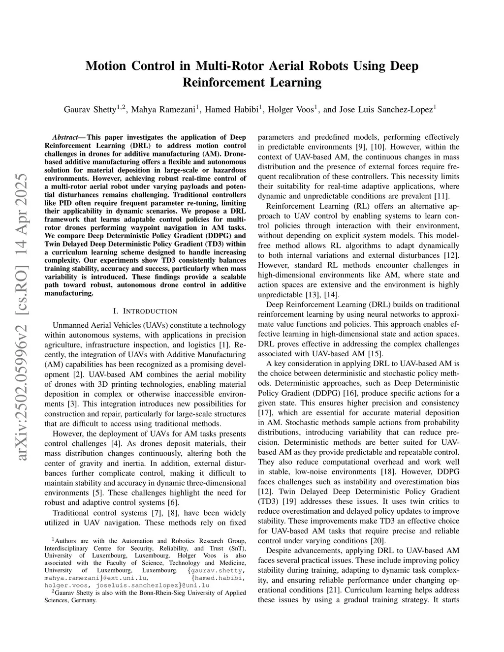 This paper investigates the application of Deep Reinforcement (DRL) Learning to address motion control challenges in drones for additive manufacturing (AM). Drone-based additive manufacturing promises flexible and autonomous material deposition in large-scale or hazardous environments. However, achieving robust real-time control of a multi-rotor aerial robot under varying payloads and potential disturbances remains challenging. Traditional controllers like PID often require frequent parameter re-tuning, limiting their applicability in dynamic scenarios. We propose a DRL framework that learns adaptable control policies for multi-rotor drones performing waypoint navigation in AM tasks. We compare Deep Deterministic Policy Gradient (DDPG) and Twin Delayed Deep Deterministic Policy Gradient (TD3) within a curriculum learning scheme designed to handle increasing complexity. Our experiments show TD3 consistently balances training stability, accuracy, and success, particularly when mass variability is introduced. These findings provide a scalable path toward robust, autonomous drone control in additive manufacturing.