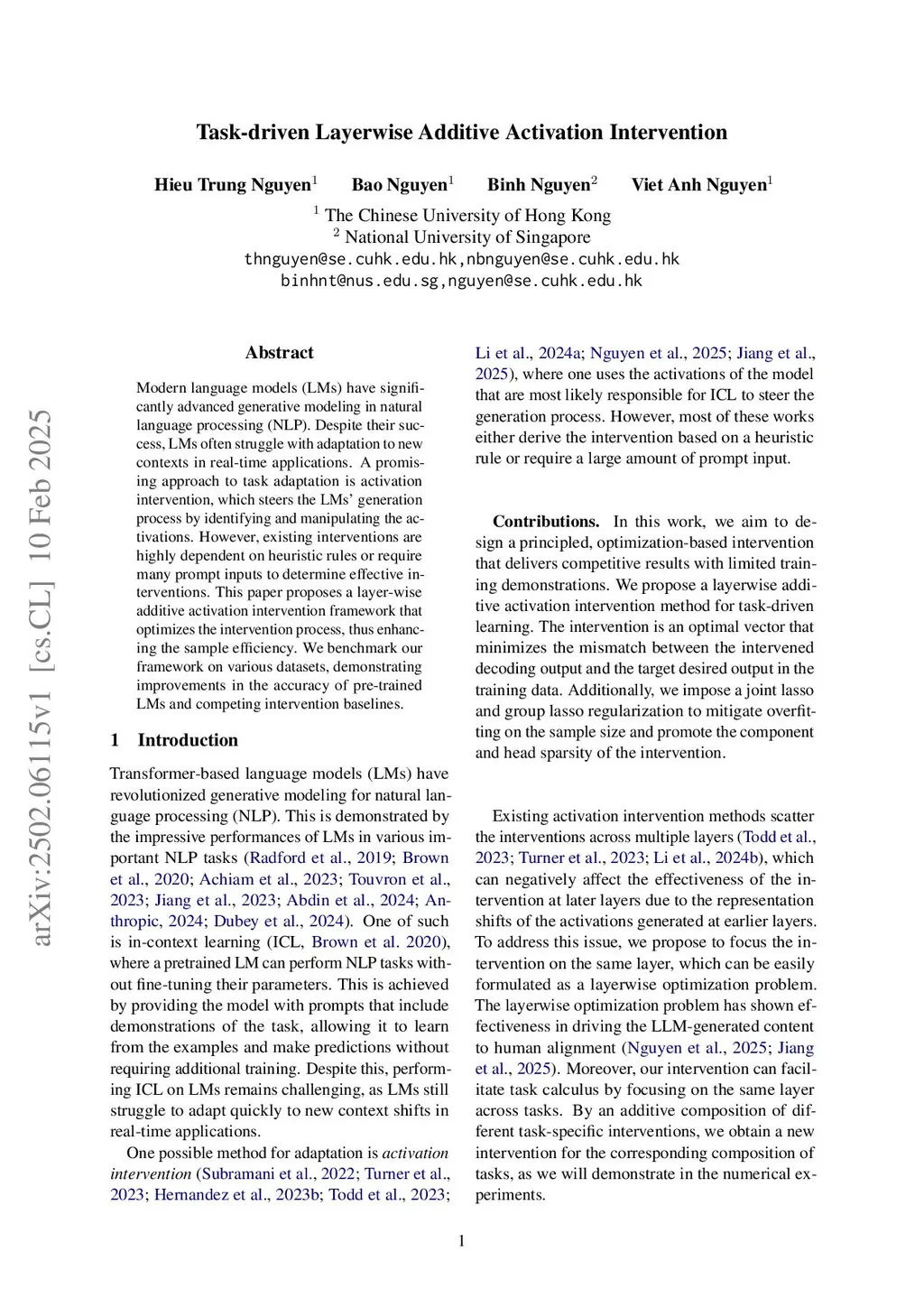 Modern language models (LMs) have significantly advanced generative modeling in natural language processing (NLP). Despite their success, LMs often struggle with adaptation to new contexts in real-time applications. A promising approach to task adaptation is activation intervention, which steers the LMs' generation process by identifying and manipulating the activations. However, existing interventions are highly dependent on heuristic rules or require many prompt inputs to determine effective interventions. This paper proposes a layer-wise additive activation intervention framework that optimizes the intervention process, thus enhancing the sample efficiency. We benchmark our framework on various datasets, demonstrating improvements in the accuracy of pre-trained LMs and competing intervention baselines.