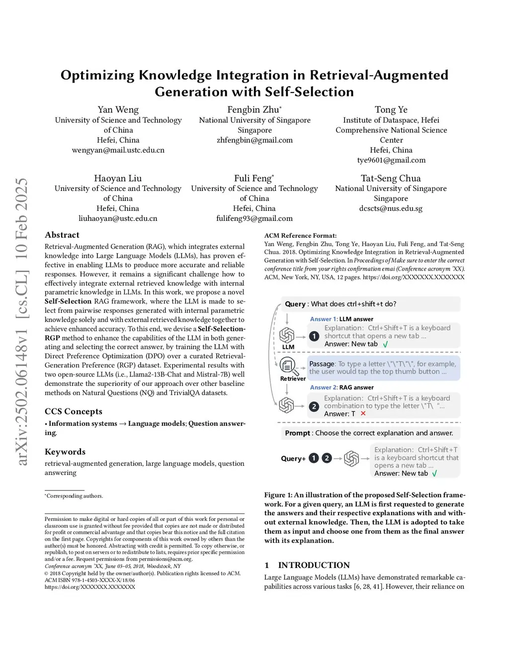 Retrieval-Augmented Generation (RAG), which integrates external knowledge into Large Language Models (LLMs), has proven effective in enabling LLMs to produce more accurate and reliable responses. However, it remains a significant challenge how to effectively integrate external retrieved knowledge with internal parametric knowledge in LLMs. In this work, we propose a novel Self-Selection RAG framework, where the LLM is made to select from pairwise responses generated with internal parametric knowledge solely and with external retrieved knowledge together to achieve enhanced accuracy. To this end, we devise a Self-Selection-RGP method to enhance the capabilities of the LLM in both generating and selecting the correct answer, by training the LLM with Direct Preference Optimization (DPO) over a curated Retrieval Generation Preference (RGP) dataset. Experimental results with two open-source LLMs (i.e., Llama2-13B-Chat and Mistral-7B) well demonstrate the superiority of our approach over other baseline methods on Natural Questions (NQ) and TrivialQA datasets.