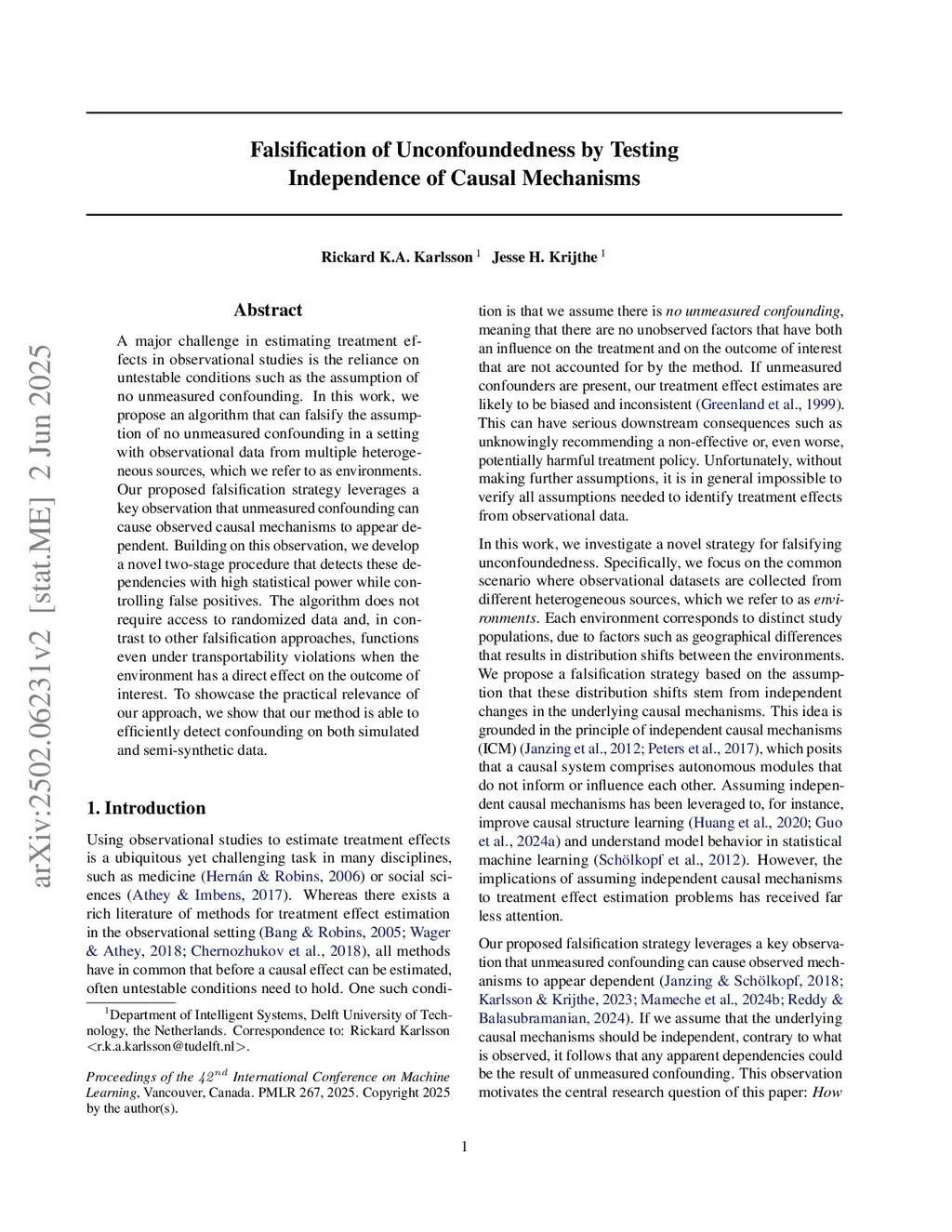 Falsification of Unconfoundedness by Testing Independence of Causal Mechanisms