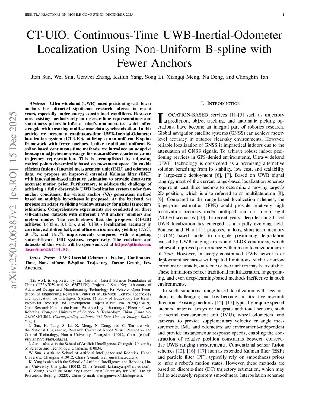 CT-UIO: Continuous-Time UWB-Inertial-Odometer Localization Using Non-Uniform B-spline with Fewer Anchors