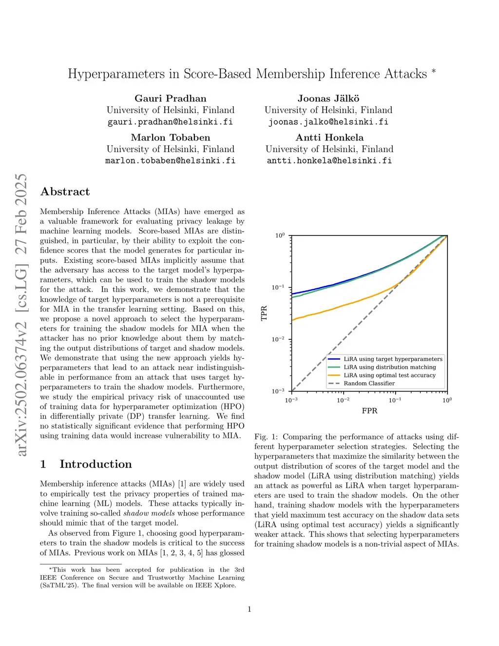 Membership Inference Attacks (MIAs) have emerged as a valuable framework for evaluating privacy leakage by machine learning models. Score-based MIAs are distinguished, in particular, by their ability to exploit the confidence scores that the model generates for particular inputs. Existing score-based MIAs implicitly assume that the adversary has access to the target model's hyperparameters, which can be used to train the shadow models for the attack. In this work, we demonstrate that the knowledge of target hyperparameters is not a prerequisite for MIA in the transfer learning setting. Based on this, we propose a novel approach to select the hyperparameters for training the shadow models for MIA when the attacker has no prior knowledge about them by matching the output distributions of target and shadow models. We demonstrate that using the new approach yields hyperparameters that lead to an attack near indistinguishable in performance from an attack that uses target hyperparameters to train the shadow models. Furthermore, we study the empirical privacy risk of unaccounted use of training data for hyperparameter optimization (HPO) in differentially private (DP) transfer learning. We find no statistically significant evidence that performing HPO using training data would increase vulnerability to MIA.