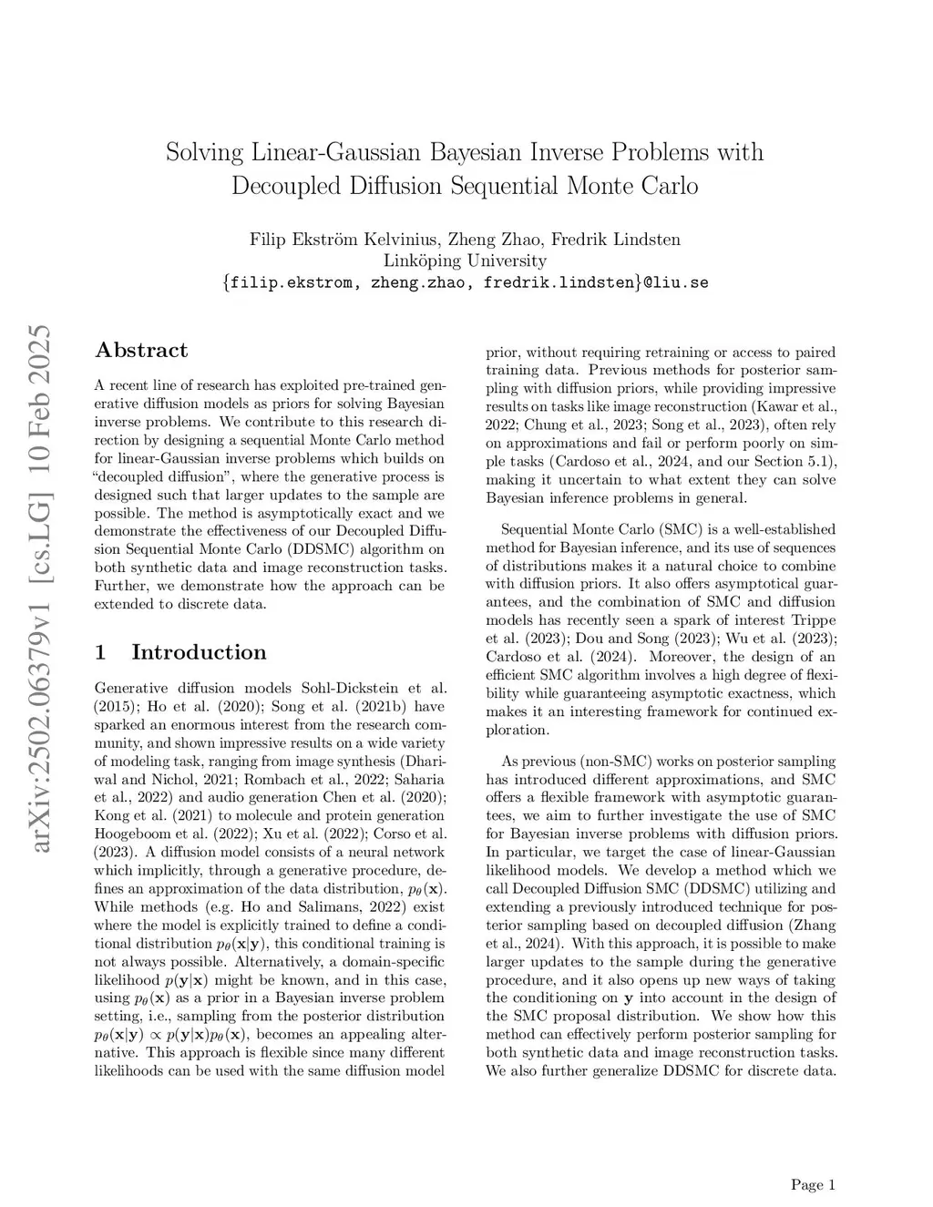 A recent line of research has exploited pre-trained generative diffusion models as priors for solving Bayesian inverse problems. We contribute to this research direction by designing a sequential Monte Carlo method for linear-Gaussian inverse problems which builds on "decoupled diffusion", where the generative process is designed such that larger updates to the sample are possible. The method is asymptotically exact and we demonstrate the effectiveness of our Decoupled Diffusion Sequential Monte Carlo (DDSMC) algorithm on both synthetic as well as protein and image data. Further, we demonstrate how the approach can be extended to discrete data.