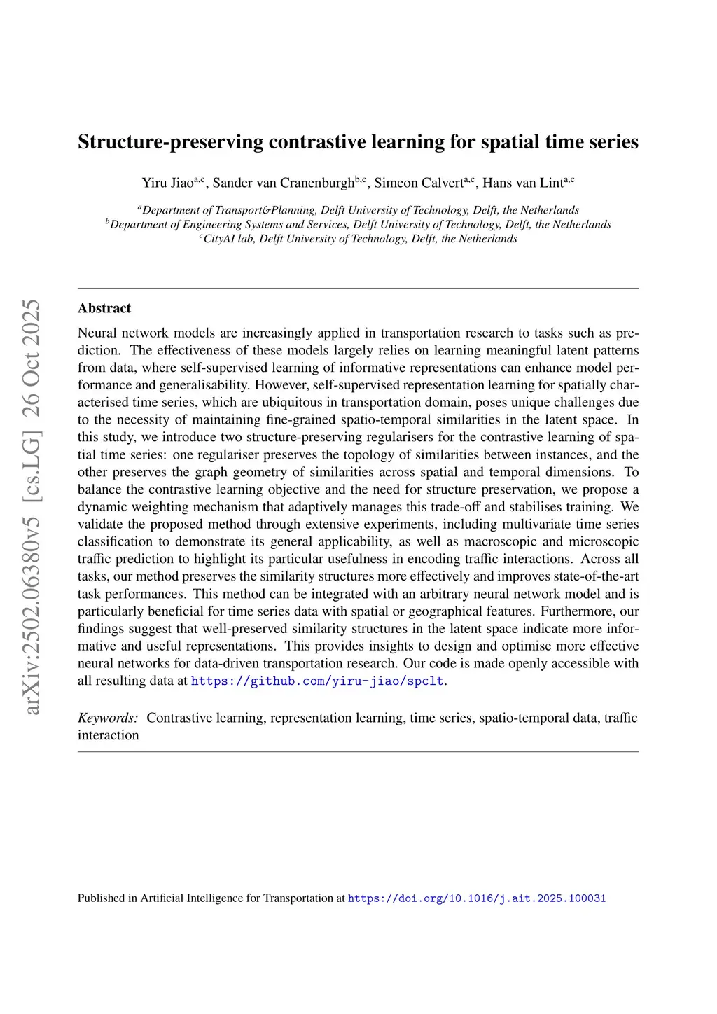 The effectiveness of neural network models largely relies on learning meaningful latent patterns from data, where self-supervised learning of informative representations can enhance model performance and generalisability. However, self-supervised representation learning for spatially characterised time series, which are ubiquitous in transportation domain, poses unique challenges due to the necessity of maintaining fine-grained spatio-temporal similarities in the latent space. In this study, we introduce two structure-preserving regularisers for the contrastive learning of spatial time series: one regulariser preserves the topology of similarities between instances, and the other preserves the graph geometry of similarities across spatial and temporal dimensions. To balance the contrastive learning objective and the need for structure preservation, we propose a dynamic weighting mechanism that adaptively manages this trade-off and stabilises training. We validate the proposed method through extensive experiments, including multivariate time series classification to demonstrate its general applicability, as well as macroscopic and microscopic traffic prediction to highlight its particular usefulness in encoding traffic interactions. Across all tasks, our method preserves the similarity structures more effectively and improves state-of-the-art task performances. This method can be integrated with an arbitrary neural network model and is particularly beneficial for time series data with spatial or geographical features. Furthermore, our findings suggest that well-preserved similarity structures in the latent space indicate more informative and useful representations. This provides insights to design more effective neural networks for data-driven transportation research. Our code is made openly accessible with all resulting data atthis https URL