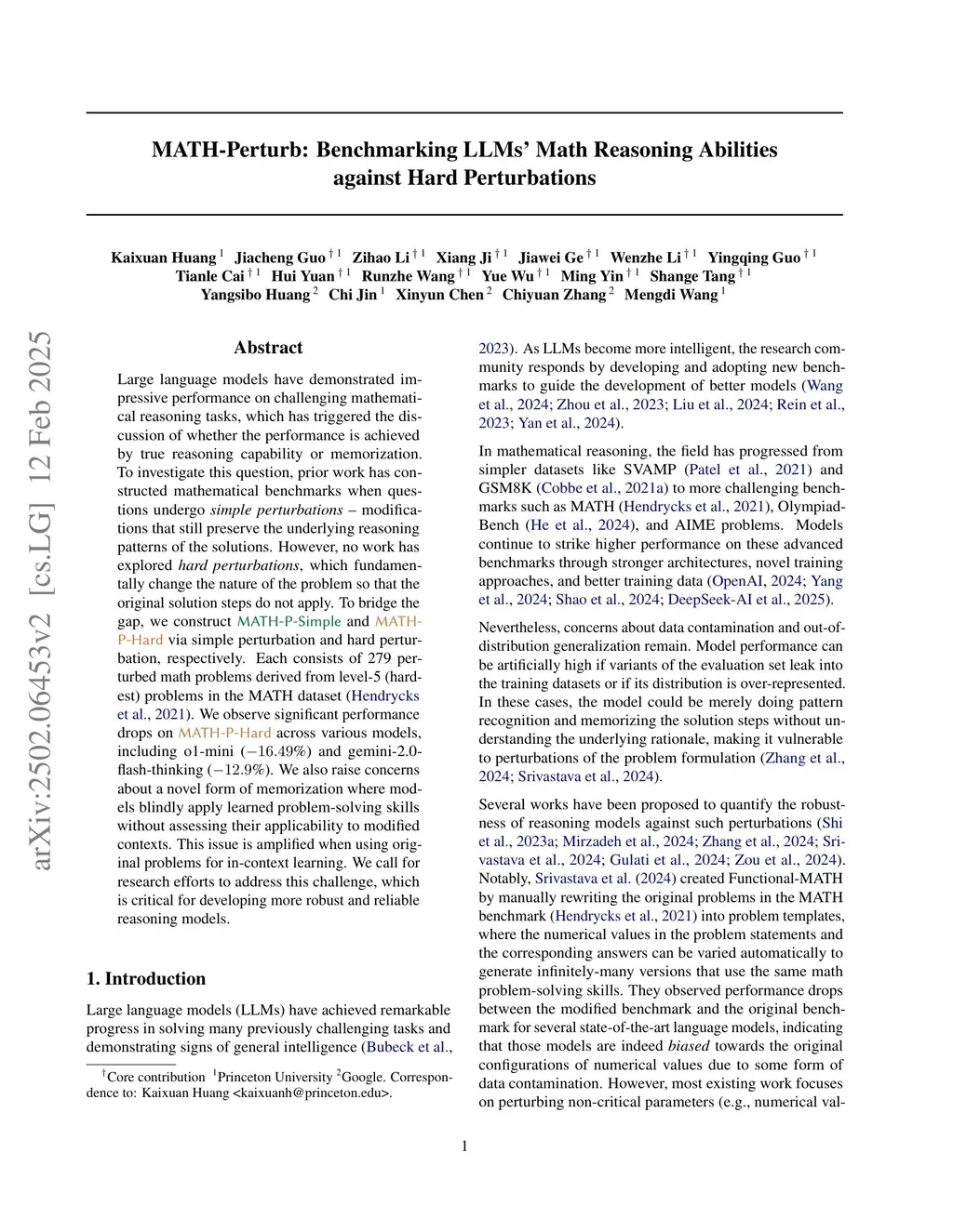 Large language models have demonstrated impressive performance on challenging mathematical reasoning tasks, which has triggered the discussion of whether the performance is achieved by true reasoning capability or memorization. To investigate this question, prior work has constructed mathematical benchmarks when questions undergo simple perturbations -- modifications that still preserve the underlying reasoning patterns of the solutions. However, no work has explored hard perturbations, which fundamentally change the nature of the problem so that the original solution steps do not apply. To bridge the gap, we construct MATH-P-Simple and MATH-P-Hard via simple perturbation and hard perturbation, respectively. Each consists of 279 perturbed math problems derived from level-5 (hardest) problems in the MATH dataset (Hendrycksmath et. al., 2021). We observe significant performance drops on MATH-P-Hard across various models, including o1-mini (-16.49%) and gemini-2.0-flash-thinking (-12.9%). We also raise concerns about a novel form of memorization where models blindly apply learned problem-solving skills without assessing their applicability to modified contexts. This issue is amplified when using original problems for in-context learning. We call for research efforts to address this challenge, which is critical for developing more robust and reliable reasoning models.