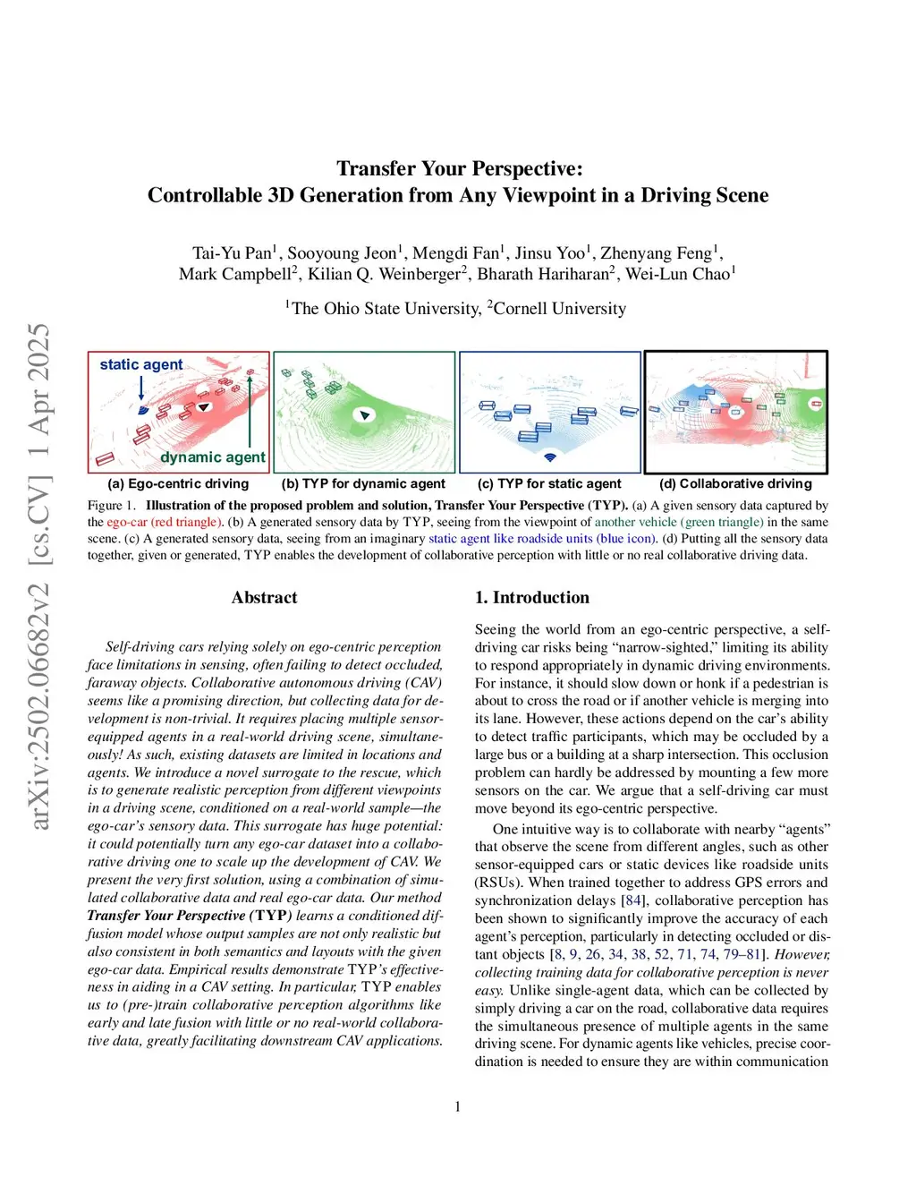 Self-driving cars relying solely on ego-centric perception face limitations in sensing, often failing to detect occluded, faraway objects. Collaborative autonomous driving (CAV) seems like a promising direction, but collecting data for development is non-trivial. It requires placing multiple sensor-equipped agents in a real-world driving scene, simultaneously! As such, existing datasets are limited in locations and agents. We introduce a novel surrogate to the rescue, which is to generate realistic perception from different viewpoints in a driving scene, conditioned on a real-world sample - the ego-car's sensory data. This surrogate has huge potential: it could potentially turn any ego-car dataset into a collaborative driving one to scale up the development of CAV. We present the very first solution, using a combination of simulated collaborative data and real ego-car data. Our method, Transfer Your Perspective (TYP), learns a conditioned diffusion model whose output samples are not only realistic but also consistent in both semantics and layouts with the given ego-car data. Empirical results demonstrate TYP's effectiveness in aiding in a CAV setting. In particular, TYP enables us to (pre-)train collaborative perception algorithms like early and late fusion with little or no real-world collaborative data, greatly facilitating downstream CAV applications.