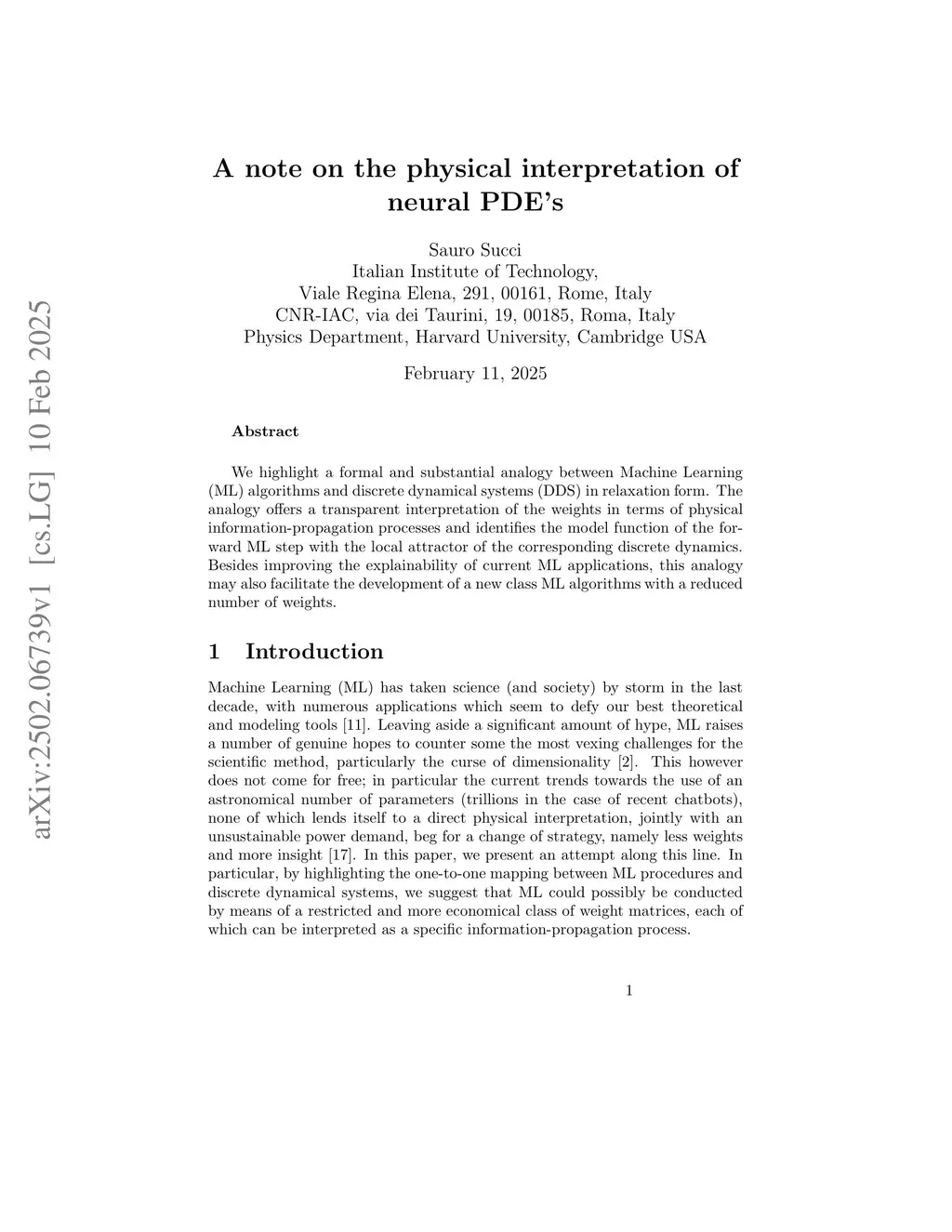 We highlight a formal and substantial analogy between Machine Learning (ML) algorithms and discrete dynamical systems (DDS) in relaxation form. The analogy offers a transparent interpretation of the weights in terms of physical information-propagation processes and identifies the model function of the forward ML step with the local attractor of the corresponding discrete dynamics. Besides improving the explainability of current ML applications, this analogy may also facilitate the development of a new class ML algorithms with a reduced number of weights.