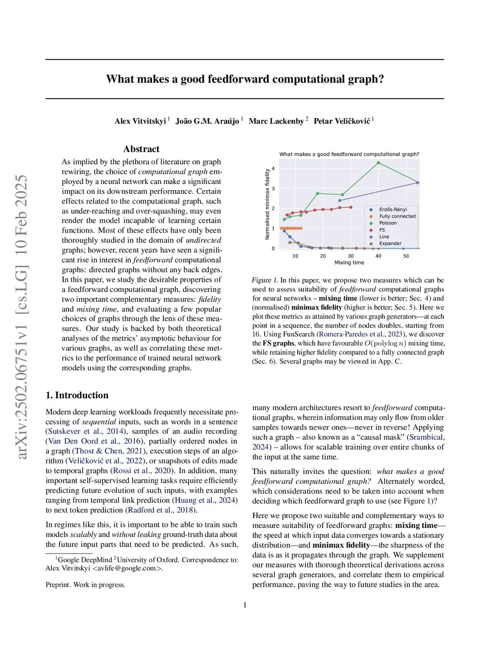 As implied by the plethora of literature on graph rewiring, the choice of computational graph employed by a neural network can make a significant impact on its downstream performance. Certain effects related to the computational graph, such as under-reaching and over-squashing, may even render the model incapable of learning certain functions. Most of these effects have only been thoroughly studied in the domain of undirected graphs; however, recent years have seen a significant rise in interest in feedforward computational graphs: directed graphs without any back edges. In this paper, we study the desirable properties of a feedforward computational graph, discovering two important complementary measures: fidelity and mixing time, and evaluating a few popular choices of graphs through the lens of these measures. Our study is backed by both theoretical analyses of the metrics' asymptotic behaviour for various graphs, as well as correlating these metrics to the performance of trained neural network models using the corresponding graphs.
