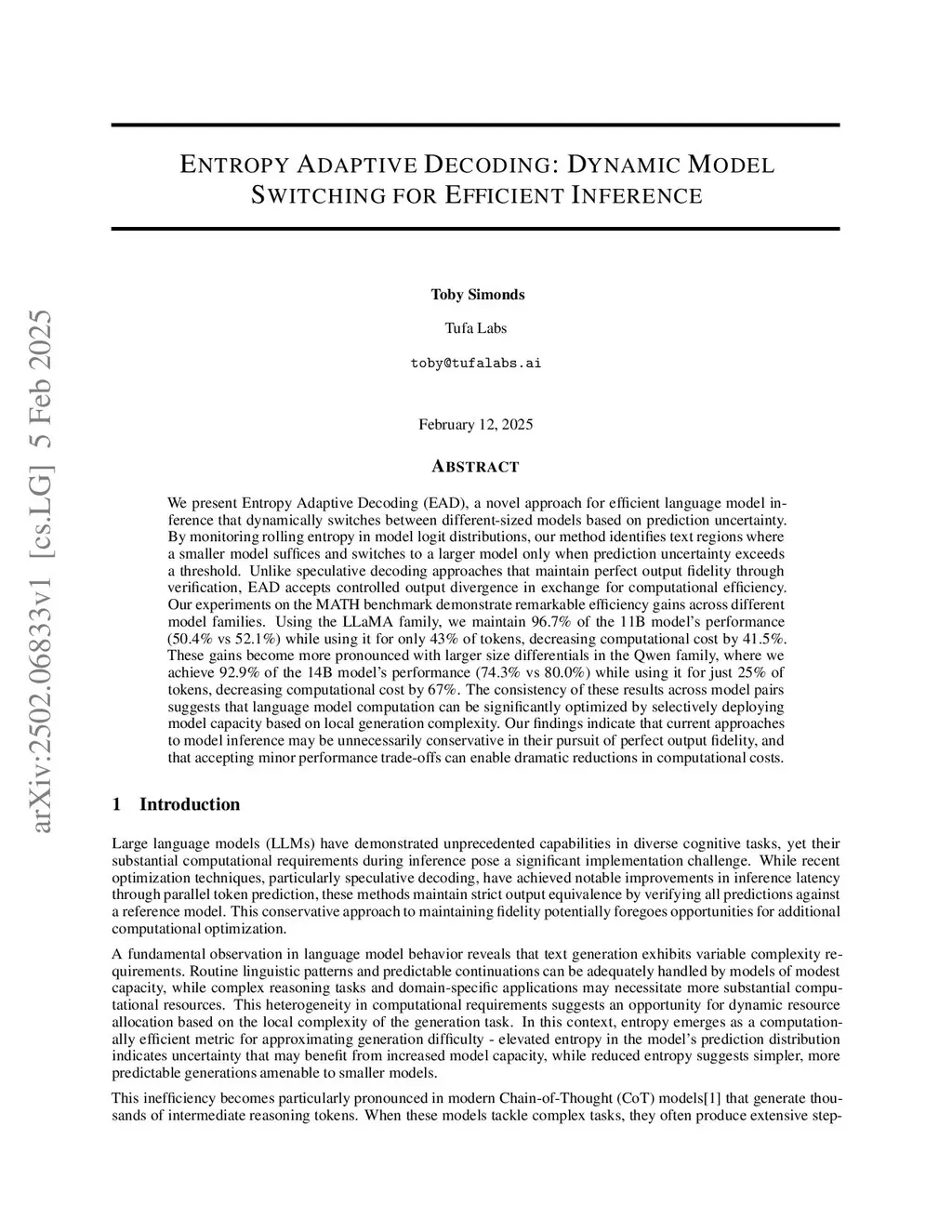 We present Entropy Adaptive Decoding (EAD), a novel approach for efficient language model inference that dynamically switches between different-sized models based on prediction uncertainty. By monitoring rolling entropy in model logit distributions, our method identifies text regions where a smaller model suffices and switches to a larger model only when prediction uncertainty exceeds a threshold. Unlike speculative decoding approaches that maintain perfect output fidelity through verification, EAD accepts controlled output divergence in exchange for computational efficiency. Our experiments on the MATH benchmark demonstrate remarkable efficiency gains across different model families. Using the LLaMA family, we maintain 96.7\% of the 11B model's performance (50.4\% vs 52.1\%) while using it for only 43\% of tokens, decreasing computational cost by 41.5\%. These gains become more pronounced with larger size differentials in the Qwen family, where we achieve 92.9\% of the 14B model's performance (74.3\% vs 80.0\%) while using it for just 25\% of tokens, decreasing computational cost by 67\%. The consistency of these results across model pairs suggests that language model computation can be significantly optimized by selectively deploying model capacity based on local generation complexity. Our findings indicate that current approaches to model inference may be unnecessarily conservative in their pursuit of perfect output fidelity, and that accepting minor performance trade-offs can enable dramatic reductions in computational costs.