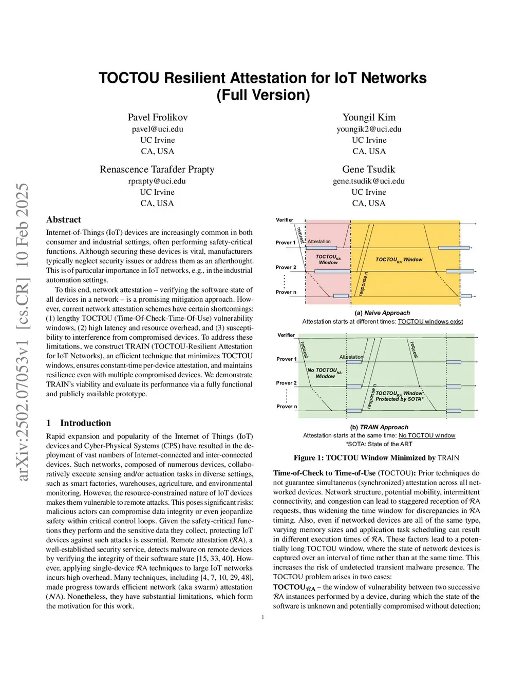 Internet-of-Things (IoT) devices are increasingly common in both consumer and industrial settings, often performing safety-critical functions. Although securing these devices is vital, manufacturers typically neglect security issues or address them as an afterthought. This is of particular importance in IoT networks, e.g., in the industrial automation settings.To this end, network attestation -- verifying the software state of all devices in a network -- is a promising mitigation approach. However, current network attestation schemes have certain shortcomings: (1) lengthy TOCTOU (Time-Of-Check-Time-Of-Use) vulnerability windows, (2) high latency and resource overhead, and (3) susceptibility to interference from compromised devices. To address these limitations, we construct TRAIN (TOCTOU-Resilient Attestation for IoT Networks), an efficient technique that minimizes TOCTOU windows, ensures constant-time per-device attestation, and maintains resilience even with multiple compromised devices. We demonstrate TRAIN's viability and evaluate its performance via a fully functional and publicly available prototype.