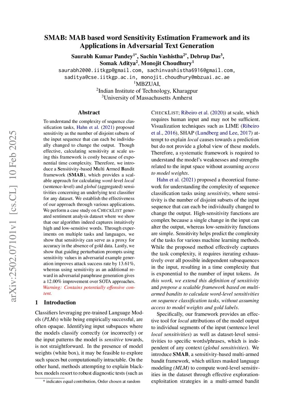 SMAB: MAB based word Sensitivity Estimation Framework and its Applications in Adversarial Text Generation