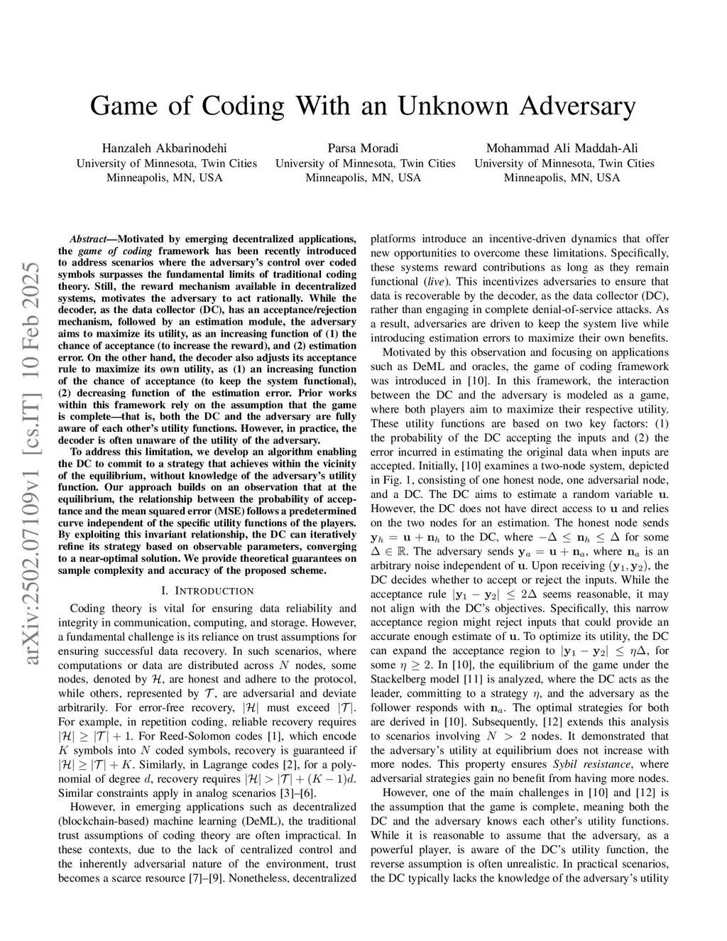 Motivated by emerging decentralized applications, the \emph{game of coding} framework has been recently introduced to address scenarios where the adversary's control over coded symbols surpasses the fundamental limits of traditional coding theory. Still, the reward mechanism available in decentralized systems, motivates the adversary to act rationally. While the decoder, as the data collector (DC), has an acceptance and rejection mechanism, followed by an estimation module, the adversary aims to maximize its utility, as an increasing function of (1) the chance of acceptance (to increase the reward), and (2) estimation error. On the other hand, the decoder also adjusts its acceptance rule to maximize its own utility, as (1) an increasing function of the chance of acceptance (to keep the system functional), (2) decreasing function of the estimation error. Prior works within this framework rely on the assumption that the game is complete, that is, both the DC and the adversary are fully aware of each other's utility functions. However, in practice, the decoder is often unaware of the utility of the adversary. To address this limitation, we develop an algorithm enabling the DC to commit to a strategy that achieves within the vicinity of the equilibrium, without knowledge of the adversary's utility function. Our approach builds on an observation that at the equilibrium, the relationship between the probability of acceptance and the mean squared error (MSE) follows a predetermined curve independent of the specific utility functions of the players. By exploiting this invariant relationship, the DC can iteratively refine its strategy based on observable parameters, converging to a near-optimal solution. We provide theoretical guarantees on sample complexity and accuracy of the proposed scheme.