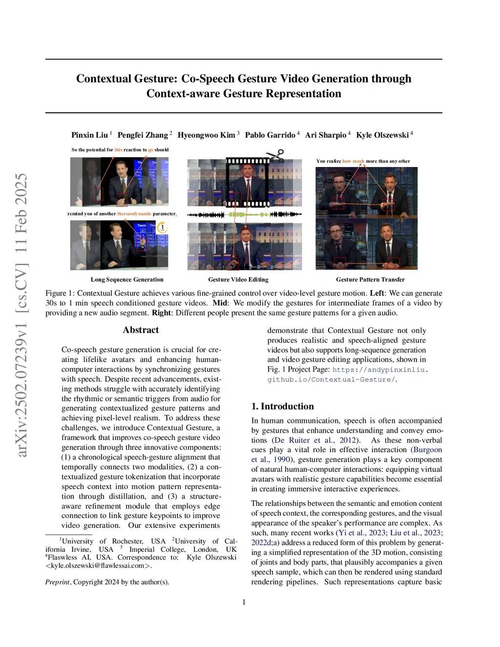 Co-speech gesture generation is crucial for creating lifelike avatars and enhancing human-computer interactions by synchronizing gestures with speech. Despite recent advancements, existing methods struggle with accurately identifying the rhythmic or semantic triggers from audio for generating contextualized gesture patterns and achieving pixel-level realism. To address these challenges, we introduce Contextual Gesture, a framework that improves co-speech gesture video generation through three innovative components: (1) a chronological speech-gesture alignment that temporally connects two modalities, (2) a contextualized gesture tokenization that incorporate speech context into motion pattern representation through distillation, and (3) a structure-aware refinement module that employs edge connection to link gesture keypoints to improve video generation. Our extensive experiments demonstrate that Contextual Gesture not only produces realistic and speech-aligned gesture videos but also supports long-sequence generation and video gesture editing applications, shown in Fig.1.