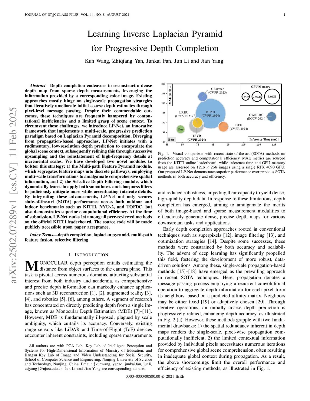 Depth completion endeavors to reconstruct a dense depth map from sparse depth measurements, leveraging the information provided by a corresponding color image. Existing approaches mostly hinge on single-scale propagation strategies that iteratively ameliorate initial coarse depth estimates through pixel-level message passing. Despite their commendable outcomes, these techniques are frequently hampered by computational inefficiencies and a limited grasp of scene context. To circumvent these challenges, we introduce LP-Net, an innovative framework that implements a multi-scale, progressive prediction paradigm based on Laplacian Pyramid decomposition. Diverging from propagation-based approaches, LP-Net initiates with a rudimentary, low-resolution depth prediction to encapsulate the global scene context, subsequently refining this through successive upsampling and the reinstatement of high-frequency details at incremental scales. We have developed two novel modules to bolster this strategy: 1) the Multi-path Feature Pyramid module, which segregates feature maps into discrete pathways, employing multi-scale transformations to amalgamate comprehensive spatial information, and 2) the Selective Depth Filtering module, which dynamically learns to apply both smoothness and sharpness filters to judiciously mitigate noise while accentuating intricate details. By integrating these advancements, LP-Net not only secures state-of-the-art (SOTA) performance across both outdoor and indoor benchmarks such as KITTI, NYUv2, and TOFDC, but also demonstrates superior computational efficiency. At the time of submission, LP-Net ranks 1st among all peer-reviewed methods on the official KITTI leaderboard.