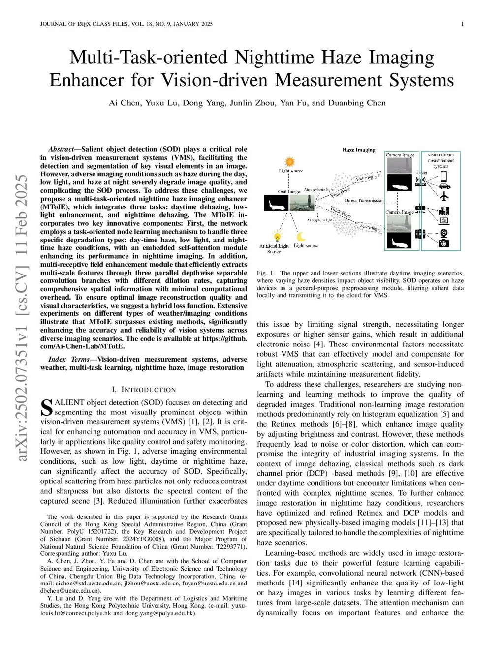 Salient object detection (SOD) plays a critical role in Intelligent Imaging, facilitating the detection and segmentation of key visual elements in an image. However, adverse imaging conditions such as haze during the day, low light, and haze at night severely degrade image quality and hinder reliable object detection in real-world scenarios. To address these challenges, we propose a multi-knowledge-oriented nighttime haze imaging enhancer (MKoIE), which integrates three tasks: daytime dehazing, low-light enhancement, and nighttime dehazing. The MKoIE incorporates two key innovative components: First, the network employs a task-oriented node learning mechanism to handle three specific degradation types: day-time haze, low light, and night-time haze conditions, with an embedded self-attention module enhancing its performance in nighttime imaging. In addition, multi-receptive field enhancement module that efficiently extracts multi-scale features through three parallel depthwise separable convolution branches with different dilation rates, capturing comprehensive spatial information with minimal computational overhead to meet the requirements of real-time imaging deployment. To ensure optimal image reconstruction quality and visual characteristics, we suggest a hybrid loss function. Extensive experiments on different types of weather/imaging conditions illustrate that MKoIE surpasses existing methods, enhancing the reliability, accuracy, and operational efficiency of intelligent imaging.