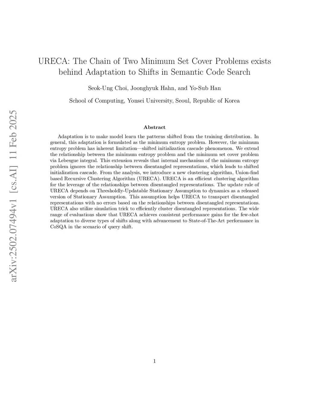 URECA: The Chain of Two Minimum Set Cover Problems exists behind Adaptation to Shifts in Semantic Code Search