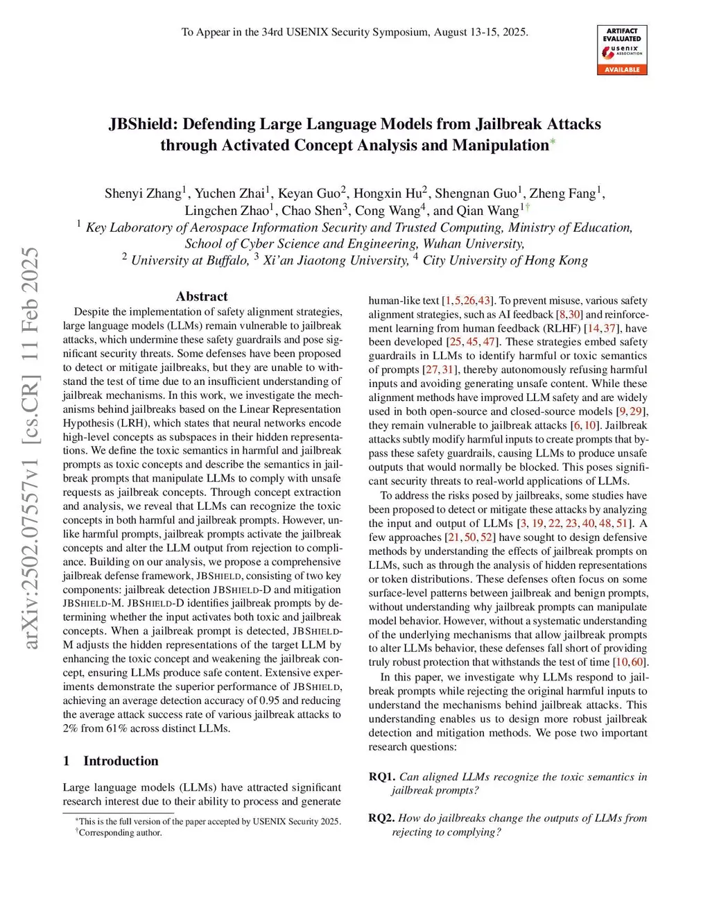 JBShield: Defending Large Language Models from Jailbreak Attacks through Activated Concept Analysis and Manipulation