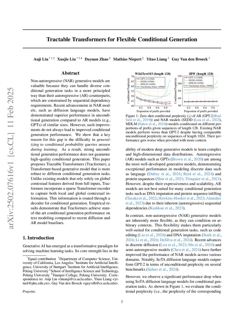 Non-autoregressive (NAR) generative models are valuable because they can handle diverse conditional generation tasks in a more principled way than their autoregressive (AR) counterparts, which are constrained by sequential dependency requirements. Recent advancements in NAR models, such as diffusion language models, have demonstrated superior performance in unconditional generation compared to AR models (e.g., GPTs) of similar sizes. However, such improvements do not always lead to improved conditional generation performance. We show that a key reason for this gap is the difficulty in generalizing to conditional probability queries (i.e., the set of unknown variables) unseen during training. As a result, strong unconditional generation performance does not guarantee high-quality conditional generation. This paper proposes Tractable Transformers (Tracformer), a Transformer-based generative model that is more robust to different conditional generation tasks. Unlike existing models that rely solely on global contextual features derived from full inputs, Tracformers incorporate a sparse Transformer encoder to capture both local and global contextual information. This information is routed through a decoder for conditional generation. Empirical results demonstrate that Tracformers achieve state-of-the-art conditional generation performance on text modeling compared to recent diffusion and AR model baselines.