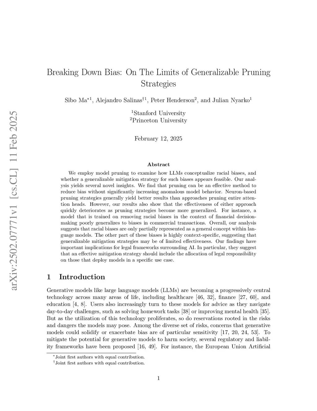 We employ model pruning to examine how LLMs conceptualize racial biases, and whether a generalizable mitigation strategy for such biases appears feasible. Our analysis yields several novel insights. We find that pruning can be an effective method to reduce bias without significantly increasing anomalous model behavior. Neuron-based pruning strategies generally yield better results than approaches pruning entire attention heads. However, our results also show that the effectiveness of either approach quickly deteriorates as pruning strategies become more generalized. For instance, a model that is trained on removing racial biases in the context of financial decision-making poorly generalizes to biases in commercial transactions. Overall, our analysis suggests that racial biases are only partially represented as a general concept within language models. The other part of these biases is highly context-specific, suggesting that generalizable mitigation strategies may be of limited effectiveness. Our findings have important implications for legal frameworks surrounding AI. In particular, they suggest that an effective mitigation strategy should include the allocation of legal responsibility on those that deploy models in a specific use case.