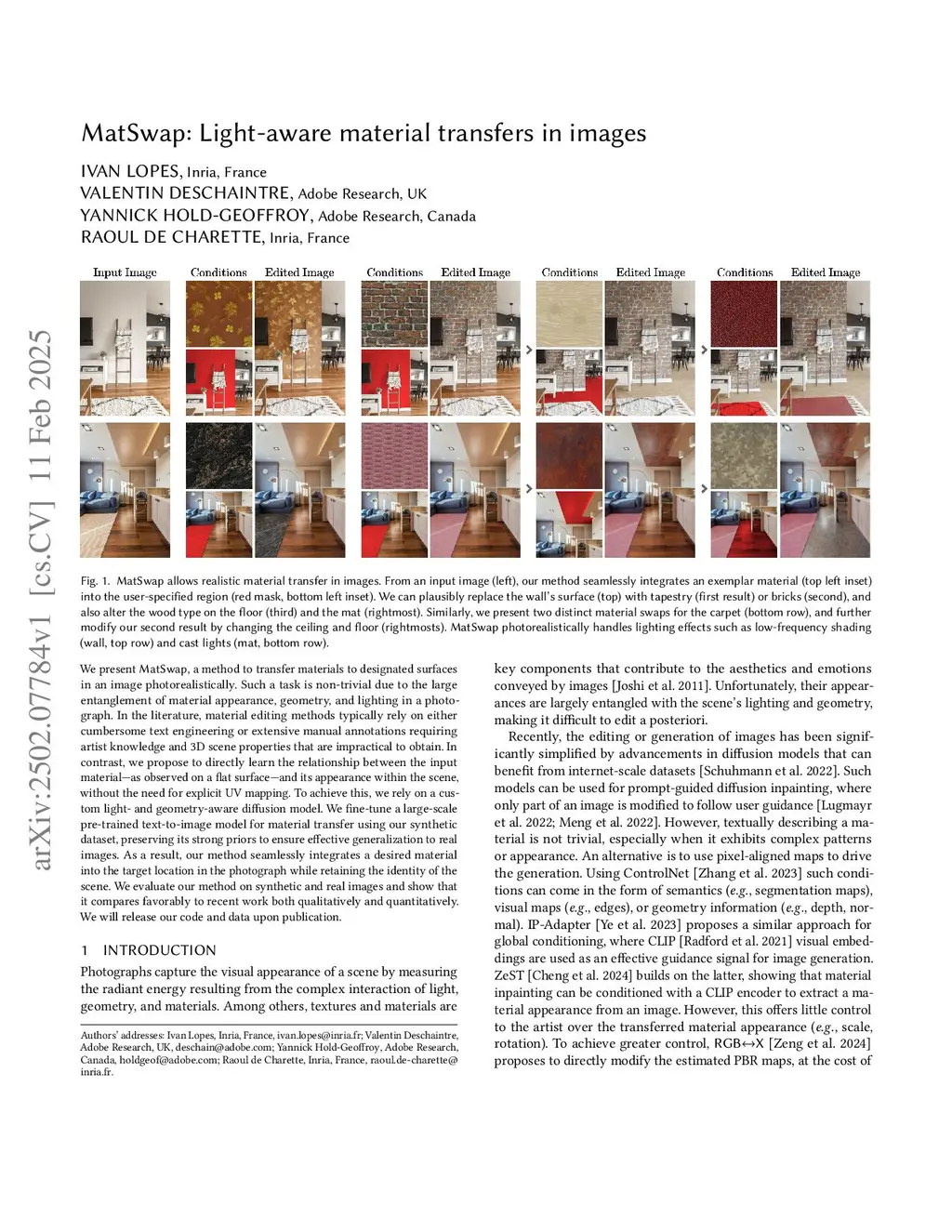 We present MatSwap, a method to transfer materials to designated surfaces in an image photorealistically. Such a task is non-trivial due to the large entanglement of material appearance, geometry, and lighting in a photograph. In the literature, material editing methods typically rely on either cumbersome text engineering or extensive manual annotations requiring artist knowledge and 3D scene properties that are impractical to obtain. In contrast, we propose to directly learn the relationship between the input material -- as observed on a flat surface -- and its appearance within the scene, without the need for explicit UV mapping. To achieve this, we rely on a custom light- and geometry-aware diffusion model. We fine-tune a large-scale pre-trained text-to-image model for material transfer using our synthetic dataset, preserving its strong priors to ensure effective generalization to real images. As a result, our method seamlessly integrates a desired material into the target location in the photograph while retaining the identity of the scene. We evaluate our method on synthetic and real images and show that it compares favorably to recent work both qualitatively and quantitatively. We release our code and data onthis https URL