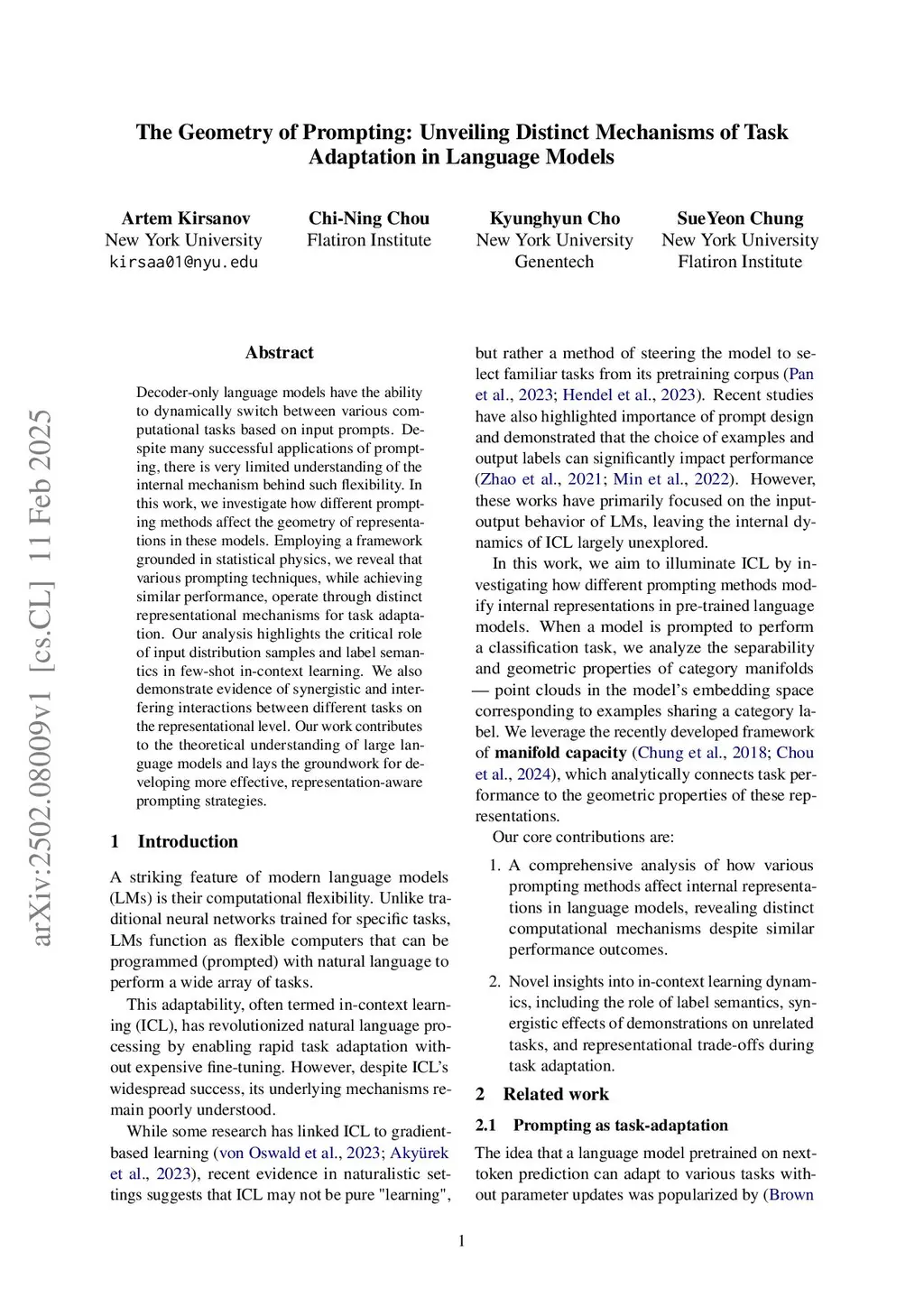 Decoder-only language models have the ability to dynamically switch between various computational tasks based on input prompts. Despite many successful applications of prompting, there is very limited understanding of the internal mechanism behind such flexibility. In this work, we investigate how different prompting methods affect the geometry of representations in these models. Employing a framework grounded in statistical physics, we reveal that various prompting techniques, while achieving similar performance, operate through distinct representational mechanisms for task adaptation. Our analysis highlights the critical role of input distribution samples and label semantics in few-shot in-context learning. We also demonstrate evidence of synergistic and interfering interactions between different tasks on the representational level. Our work contributes to the theoretical understanding of large language models and lays the groundwork for developing more effective, representation-aware prompting strategies.