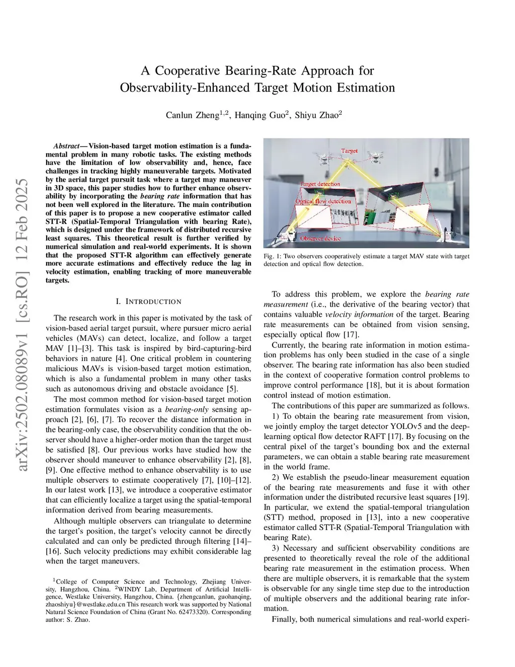 Vision-based target motion estimation is a fundamental problem in many robotic tasks. The existing methods have the limitation of low observability and, hence, face challenges in tracking highly maneuverable targets. Motivated by the aerial target pursuit task where a target may maneuver in 3D space, this paper studies how to further enhance observability by incorporating the \emph{bearing rate} information that has not been well explored in the literature. The main contribution of this paper is to propose a new cooperative estimator called STT-R (Spatial-Temporal Triangulation with bearing Rate), which is designed under the framework of distributed recursive least squares. This theoretical result is further verified by numerical simulation and real-world experiments. It is shown that the proposed STT-R algorithm can effectively generate more accurate estimations and effectively reduce the lag in velocity estimation, enabling tracking of more maneuverable targets.