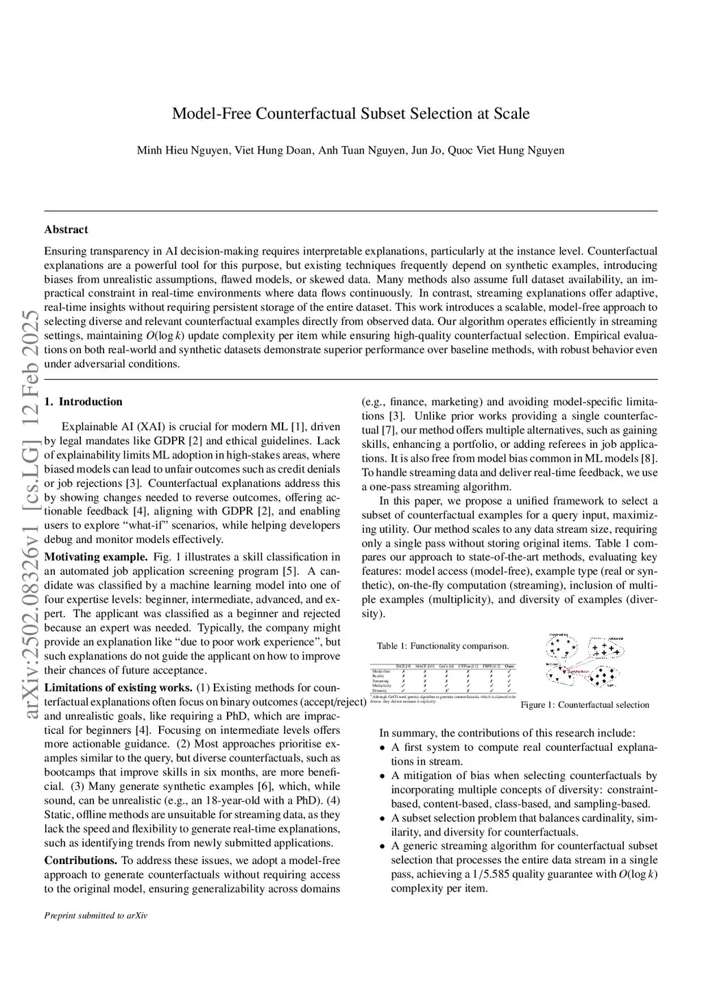 Ensuring transparency in AI decision-making requires interpretable explanations, particularly at the instance level. Counterfactual explanations are a powerful tool for this purpose, but existing techniques frequently depend on synthetic examples, introducing biases from unrealistic assumptions, flawed models, or skewed data. Many methods also assume full dataset availability, an impractical constraint in real-time environments where data flows continuously. In contrast, streaming explanations offer adaptive, real-time insights without requiring persistent storage of the entire dataset. This work introduces a scalable, model-free approach to selecting diverse and relevant counterfactual examples directly from observed data. Our algorithm operates efficiently in streaming settings, maintaining update complexity per item while ensuring high-quality counterfactual selection. Empirical evaluations on both real-world and synthetic datasets demonstrate superior performance over baseline methods, with robust behavior even under adversarial conditions.