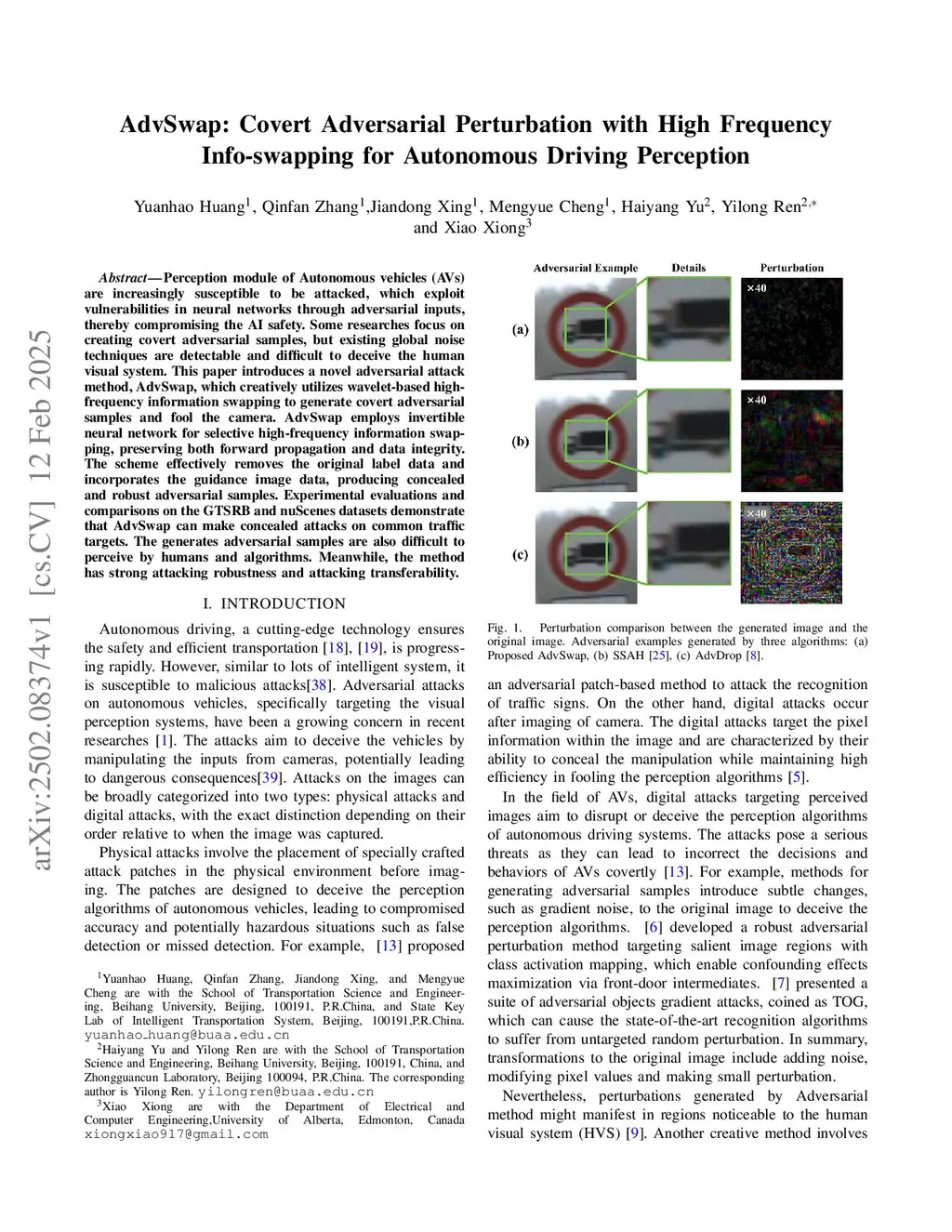 Perception module of Autonomous vehicles (AVs) are increasingly susceptible to be attacked, which exploit vulnerabilities in neural networks through adversarial inputs, thereby compromising the AI safety. Some researches focus on creating covert adversarial samples, but existing global noise techniques are detectable and difficult to deceive the human visual system. This paper introduces a novel adversarial attack method, AdvSwap, which creatively utilizes wavelet-based high-frequency information swapping to generate covert adversarial samples and fool the camera. AdvSwap employs invertible neural network for selective high-frequency information swapping, preserving both forward propagation and data integrity. The scheme effectively removes the original label data and incorporates the guidance image data, producing concealed and robust adversarial samples. Experimental evaluations and comparisons on the GTSRB and nuScenes datasets demonstrate that AdvSwap can make concealed attacks on common traffic targets. The generates adversarial samples are also difficult to perceive by humans and algorithms. Meanwhile, the method has strong attacking robustness and attacking transferability.