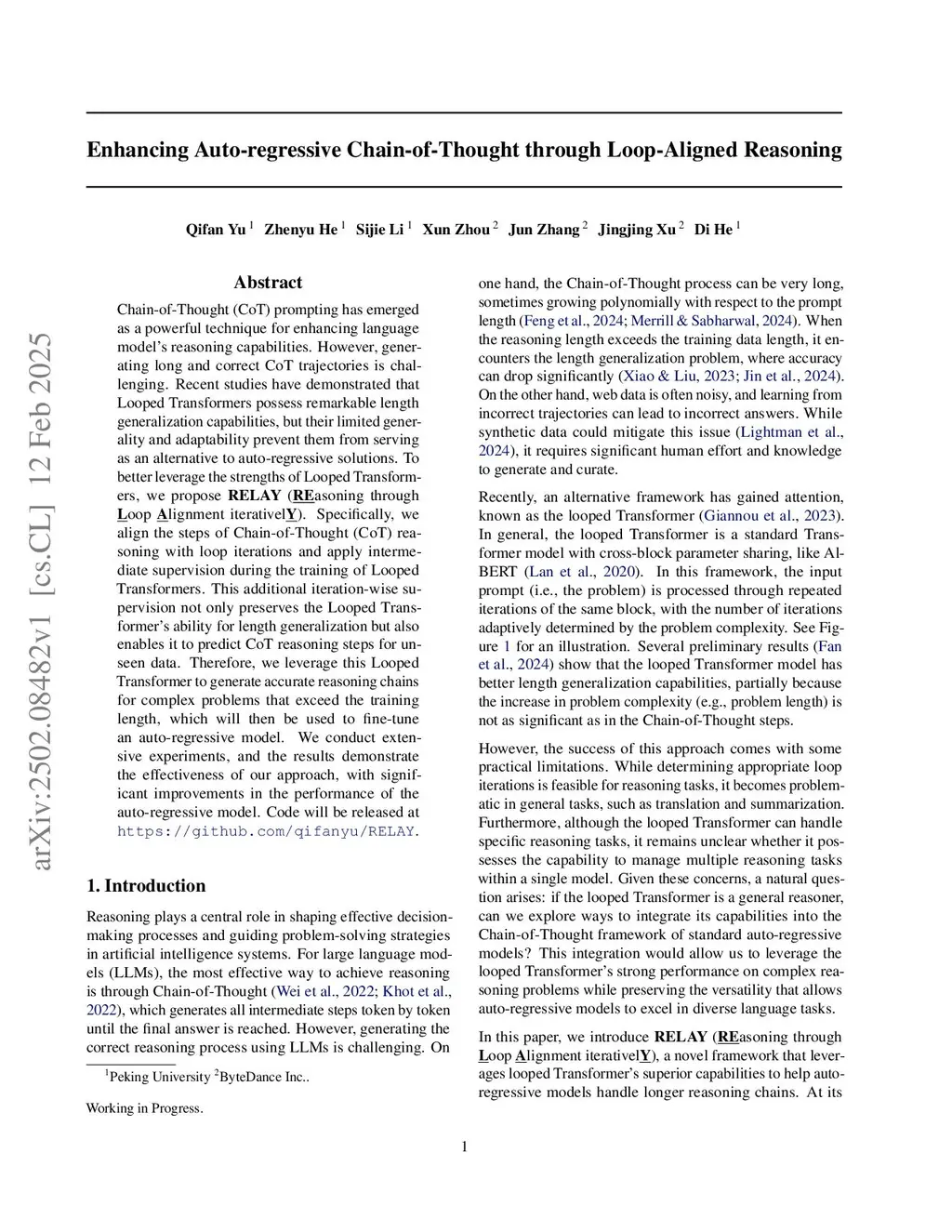 Chain-of-Thought (CoT) prompting has emerged as a powerful technique for enhancing language model's reasoning capabilities. However, generating long and correct CoT trajectories is challenging. Recent studies have demonstrated that Looped Transformers possess remarkable length generalization capabilities, but their limited generality and adaptability prevent them from serving as an alternative to auto-regressive solutions. To better leverage the strengths of Looped Transformers, we propose RELAY (REasoning through Loop Alignment iterativelY). Specifically, we align the steps of Chain-of-Thought (CoT) reasoning with loop iterations and apply intermediate supervision during the training of Looped Transformers. This additional iteration-wise supervision not only preserves the Looped Transformer's ability for length generalization but also enables it to predict CoT reasoning steps for unseen data. Therefore, we leverage this Looped Transformer to generate accurate reasoning chains for complex problems that exceed the training length, which will then be used to fine-tune an auto-regressive model. We conduct extensive experiments, and the results demonstrate the effectiveness of our approach, with significant improvements in the performance of the auto-regressive model. Code will be released atthis https URL.