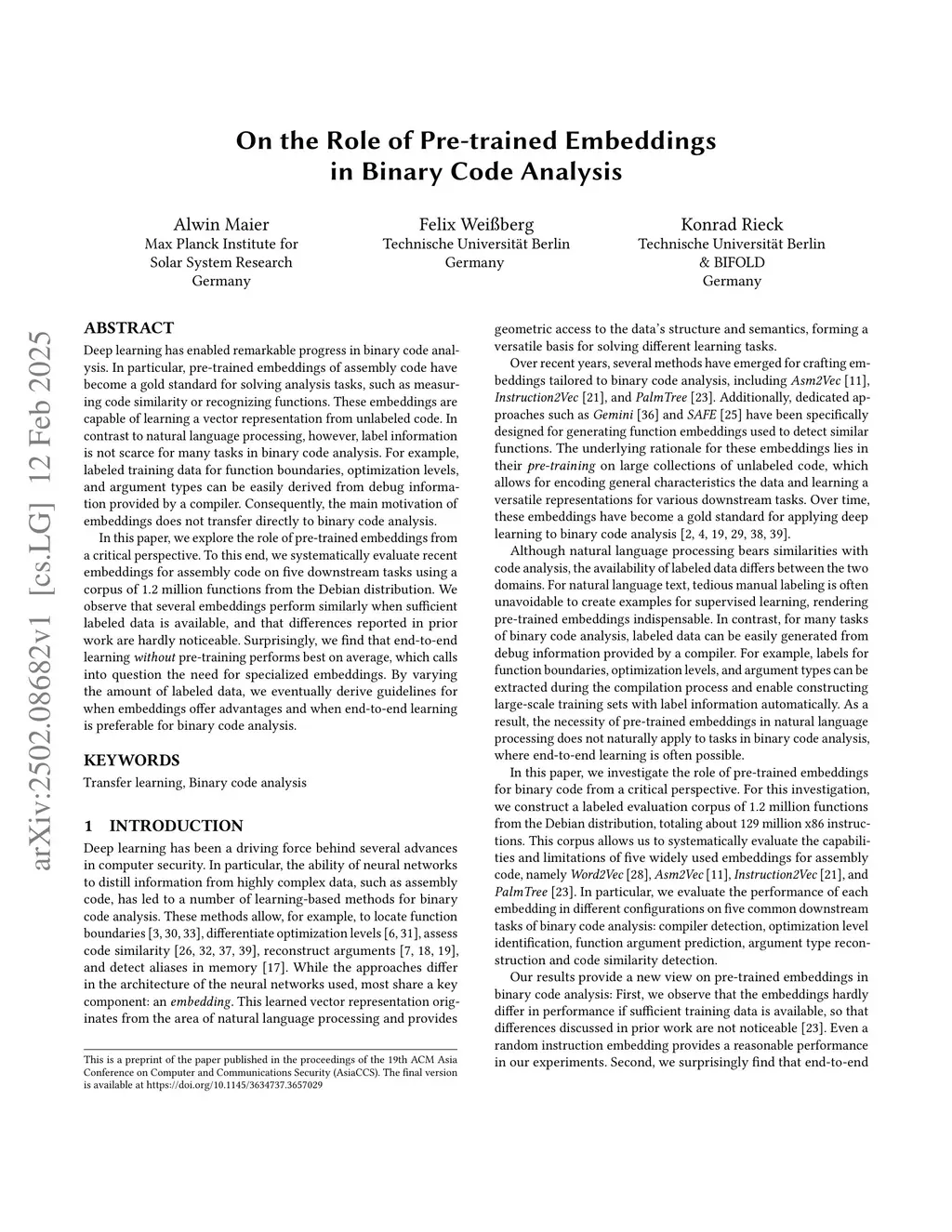 On the Role of Pre-trained Embeddings in Binary Code Analysis