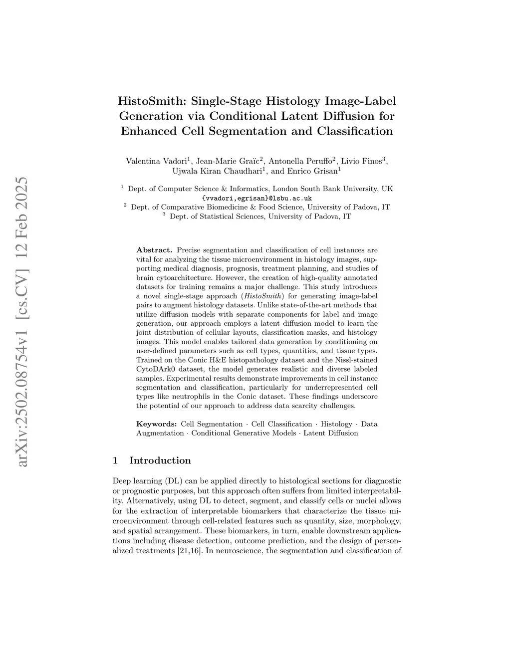 Precise segmentation and classification of cell instances are vital for analyzing the tissue microenvironment in histology images, supporting medical diagnosis, prognosis, treatment planning, and studies of brain cytoarchitecture. However, the creation of high-quality annotated datasets for training remains a major challenge. This study introduces a novel single-stage approach (HistoSmith) for generating image-label pairs to augment histology datasets. Unlike state-of-the-art methods that utilize diffusion models with separate components for label and image generation, our approach employs a latent diffusion model to learn the joint distribution of cellular layouts, classification masks, and histology images. This model enables tailored data generation by conditioning on user-defined parameters such as cell types, quantities, and tissue types. Trained on the Conic H&E histopathology dataset and the Nissl-stained CytoDArk0 dataset, the model generates realistic and diverse labeled samples. Experimental results demonstrate improvements in cell instance segmentation and classification, particularly for underrepresented cell types like neutrophils in the Conic dataset. These findings underscore the potential of our approach to address data scarcity challenges.
