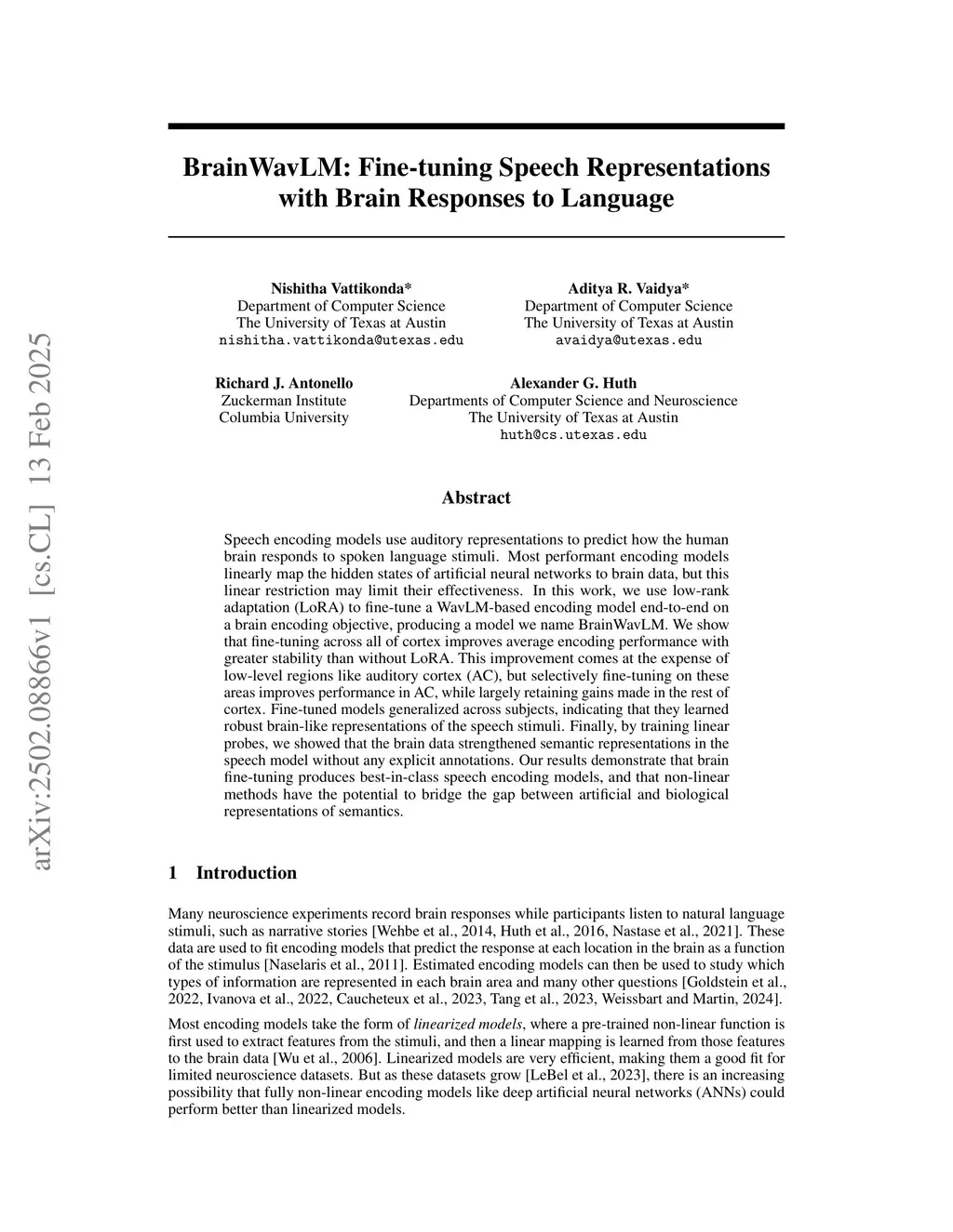 Speech encoding models use auditory representations to predict how the human brain responds to spoken language stimuli. Most performant encoding models linearly map the hidden states of artificial neural networks to brain data, but this linear restriction may limit their effectiveness. In this work, we use low-rank adaptation (LoRA) to fine-tune a WavLM-based encoding model end-to-end on a brain encoding objective, producing a model we name BrainWavLM. We show that fine-tuning across all of cortex improves average encoding performance with greater stability than without LoRA. This improvement comes at the expense of low-level regions like auditory cortex (AC), but selectively fine-tuning on these areas improves performance in AC, while largely retaining gains made in the rest of cortex. Fine-tuned models generalized across subjects, indicating that they learned robust brain-like representations of the speech stimuli. Finally, by training linear probes, we showed that the brain data strengthened semantic representations in the speech model without any explicit annotations. Our results demonstrate that brain fine-tuning produces best-in-class speech encoding models, and that non-linear methods have the potential to bridge the gap between artificial and biological representations of semantics.