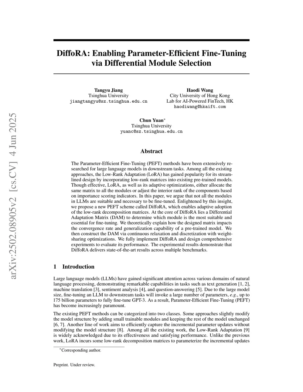 The Parameter-Efficient Fine-Tuning (PEFT) methods have been extensively researched for large language models in downstream tasks. Among all the existing approaches, the Low-Rank Adaptation (LoRA) has gained popularity for its streamlined design by incorporating low-rank matrices into existing pre-trained models. Though effective, LoRA, as well as its adaptive optimizations, either allocate the same matrix to all the modules or adjust the interior rank of the components based on importance scoring indicators. In this paper, we argue that not all the modules in LLMs are suitable and necessary to be fine-tuned. Enlightened by this insight, we propose a new PEFT scheme called DiffoRA, which enables adaptive adoption of the low-rank decomposition matrices. At the core of DiffoRA lies a Differential Adaptation Matrix (DAM) to determine which module is the most suitable and essential for fine-tuning. We theoretically explain how the designed matrix impacts the convergence rate and generalization capability of a pre-trained model. We then construct the DAM via continuous relaxation and discretization with weight-sharing optimizations. We fully implement DiffoRA and design comprehensive experiments to evaluate its performance. The experimental results demonstrate that DiffoRA delivers state-of-the-art results across multiple benchmarks.