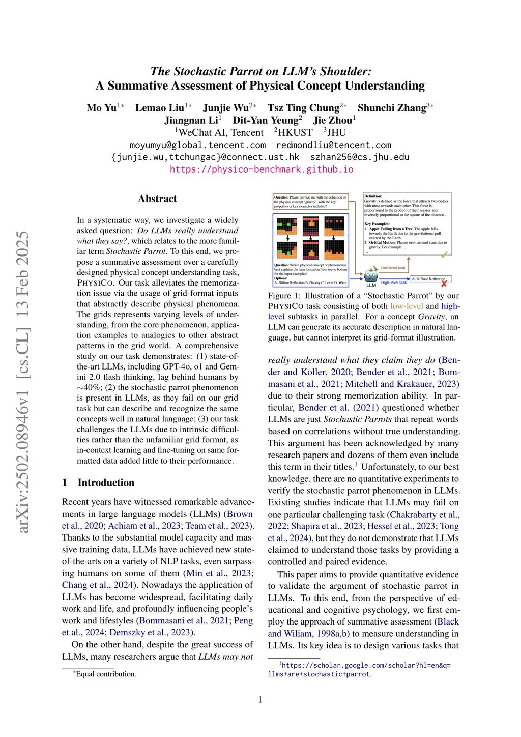 In a systematic way, we investigate a widely asked question: Do LLMs really understand what they say?, which relates to the more familiar term Stochastic Parrot. To this end, we propose a summative assessment over a carefully designed physical concept understanding task, PhysiCo. Our task alleviates the memorization issue via the usage of grid-format inputs that abstractly describe physical phenomena. The grids represents varying levels of understanding, from the core phenomenon, application examples to analogies to other abstract patterns in the grid world. A comprehensive study on our task demonstrates: (1) state-of-the-art LLMs, including GPT-4o, o1 and Gemini 2.0 flash thinking, lag behind humans by ~40%; (2) the stochastic parrot phenomenon is present in LLMs, as they fail on our grid task but can describe and recognize the same concepts well in natural language; (3) our task challenges the LLMs due to intrinsic difficulties rather than the unfamiliar grid format, as in-context learning and fine-tuning on same formatted data added little to their performance.